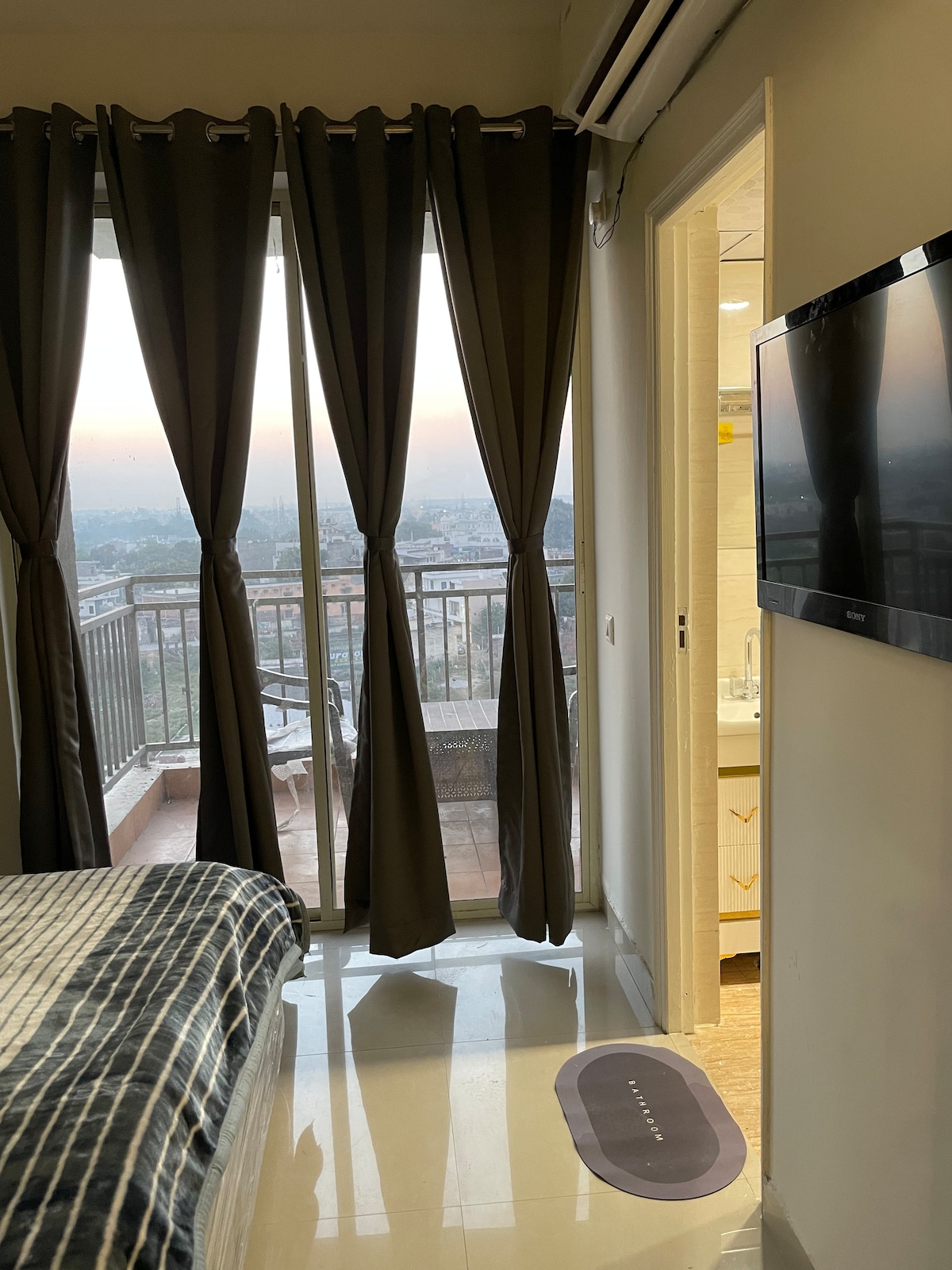 Welcome to The Midnight, your ideal retreat in Karnal! This newly built, couple and family-friendly 2 BHK apartment on the 10th floor of Smart Homes in Sector 32A offers breathtaking views. Each double bedroom features an attached bathroom and private balcony. The elegant living area includes a comfortable sofa, flat-screen TV, and dining space. A fully equipped kitchen with refrigerator and RO water purifier is provided, along with amenities like a geyser, lift access, and 24/7 water supply .
