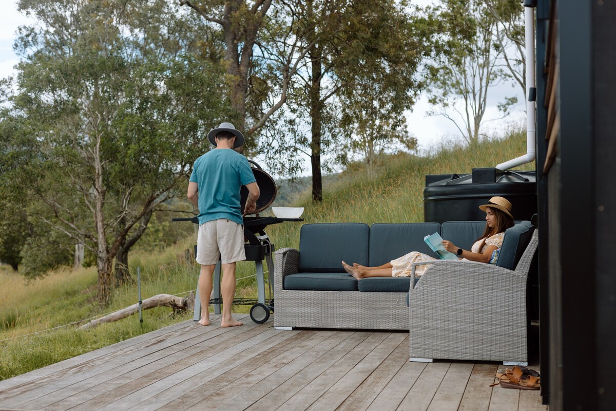 Welcome to our luxurious & cosy 'Yindilli' cabin (meaning kingfisher). Perfect for romance, relaxation or a creative retreat, this cabin is nestled in lush, tranquil surroundings. A fabulous place to unwind & reconnect with your partner or yourself. Switch off by curling up with a book as you admire the view. Light a fire & ground in nature, or enjoy the deck with a glass of wine while the birds sing. Beaches, nature walks, markets & restaurants are all within 20min. Book this experience now!