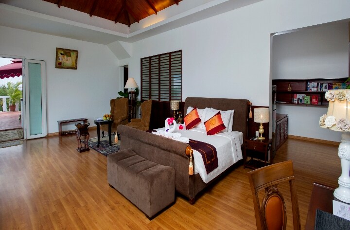It is a beach front villa in La Maison Gành Đỏ Phu Yen, 408 m2, there are 4 bedrooms, 1 master bedroom and 3 bedrooms sharing 2 toilets. It has living room and kitchen where you can cook with the local materials. The maid can help to clean up and cook with small tip.