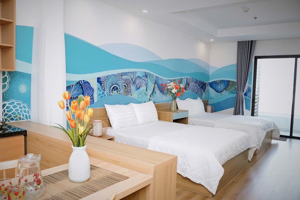 Enjoy a stylish experience at this prime location. This modern apartment is just steps away from stunning Quy Nhon beach with cafes, local restaurants and bars conveniently located right outside. It’s a perfect spot for those who want to enjoy all that Quy Nhon has to offer. Featuring 2 comfortable beds, a sleek bathroom, and a balcony offering breathtaking views of the city and beach. This apartment is perfect for families, couples, or friends traveling together.