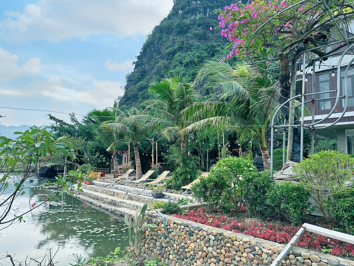 Located in the Trang An area, the bungalow in the beautiful garden and swimming pool is everything you need to enjoy your trip to Ninh Binh. Located by the beautiful Sao Khe River, close to any must-go destinations in Ninh Binh such as Hoa Lu Ancient Capitol (within 7 mins), Trang An boat trip (within 10 mins), Am Tien temple aka Tuyet Tinh Coc (within 5 mins), Hang Mua trekking point (within 10 mins), Tam Coc (15 mins). Only 15 minutes away from Ninh Binh City, it's a perfect getaway for you