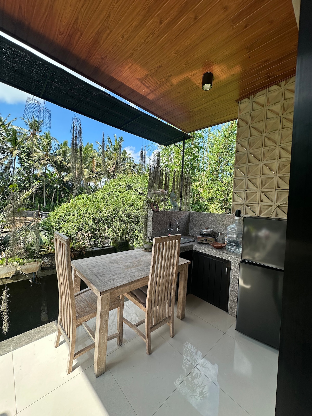 Immerse yourself in tranquility in this luxurious jungle apartment, just 10 minutes from Ubud centre. Designed for deep rest and slow living, this one-bedroom retreat is ideal for couples or solo travelers. Wake to birdsong and soft jungle light, surrounded by lush treetops. A scenic walk through the Balinese village leads to the river and nearby waterfall. Breakfast and meals can be ordered from the on-site restaurant and delivered to your apartment.
