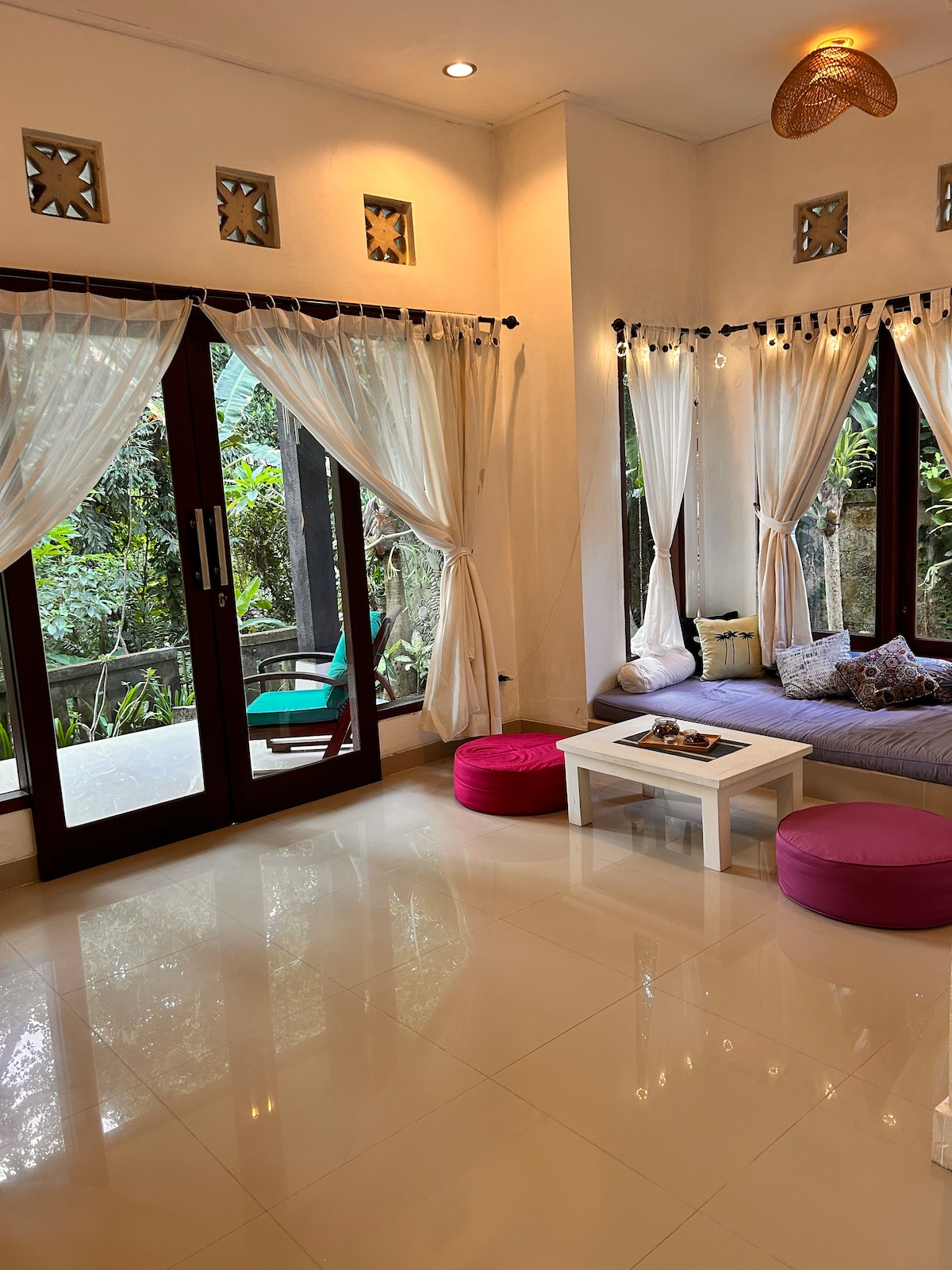 Super central, yogi style, nice decorated space with soft feeling antique made floor, plus walls, windows. Colourful comfy cushions, hammock, nice balcony & kitchen. It’s situated next to the entrance of a guesthouse with beautiful common garden and swimming pool we can use. We are in between Hanoman - & Monkey Forest street, with all you need, incl. culture, (vegan) restaurants, on walking distance. We rent out without breakfast so you can also find us on airbnob. :-) See you