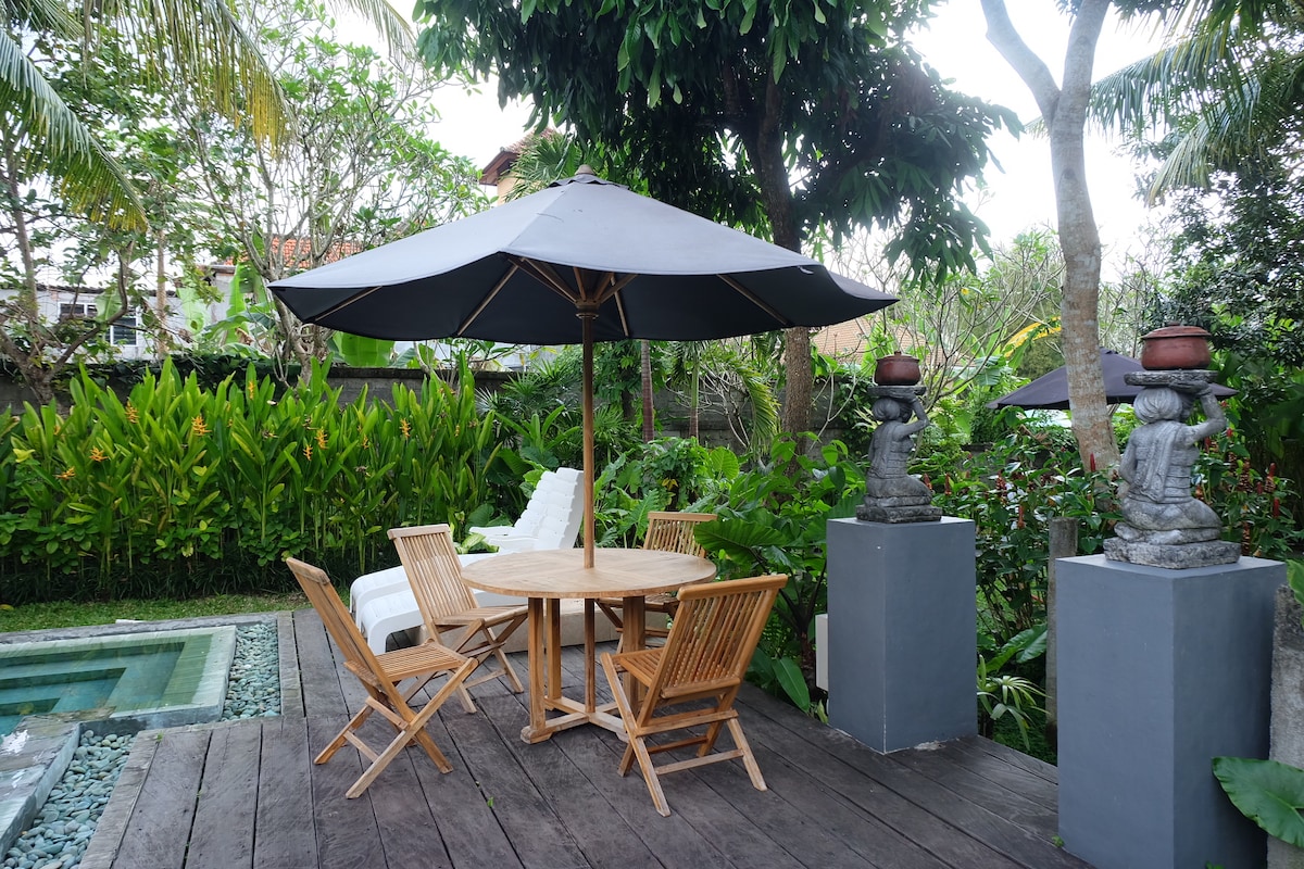 A newly built private 3bdr house for chasers of an authentic Indonesian character and a comfortable sleep. This 150 year-old solid wood redesigned house is full of eye-pleasing features. Based in a quiet cul-de-sac neighbourhood on top of a canyon. Offering ample natural light thanks to all-round glass doors and windows, our modern interior is light and dry. The long pool and yoga terrace are a bonus. A perfect spot for sunrise, Mt Agung and bird-watching!