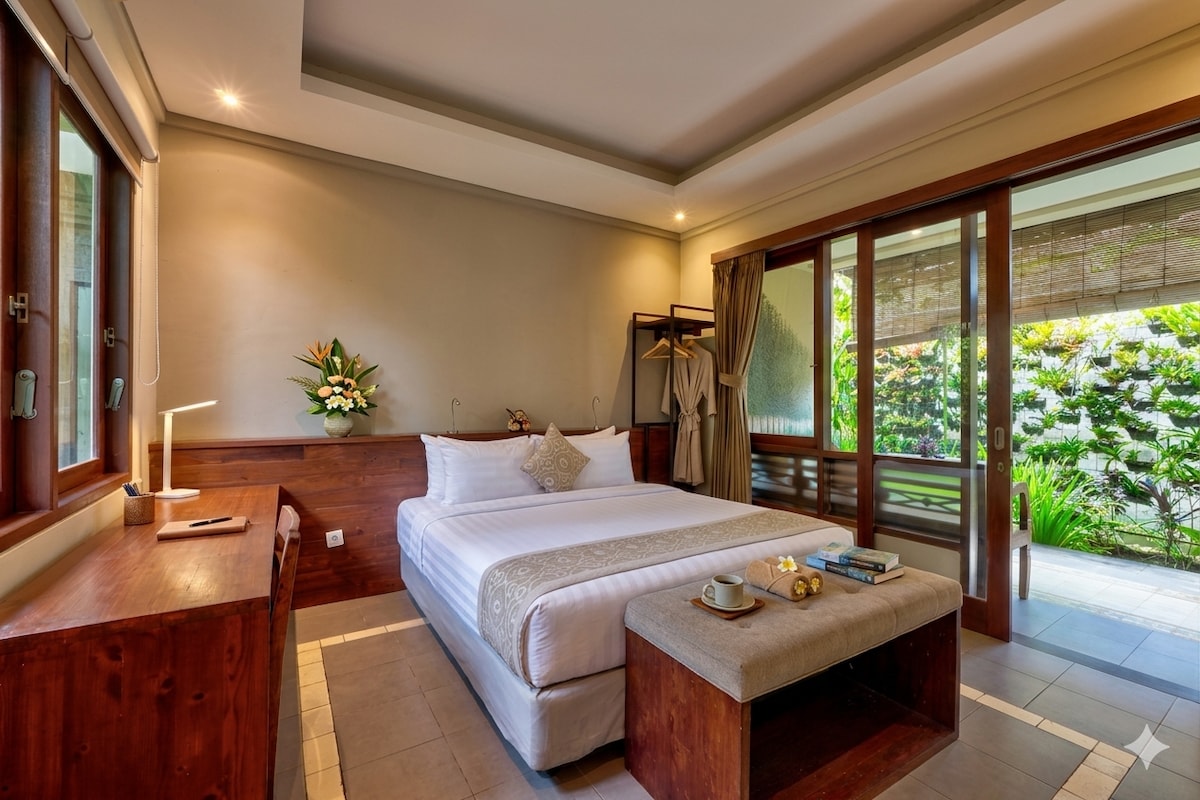 Why You’ll Love It: 1. Quiet alley, just minutes from Ubud Center 2. Private balcony with nature views 3. Free breakfast delivered daily 4. AC and a comfortable bed 5. Fast Wi-Fi + table and chair, for remote work 6. Private bathroom with hot/cold shower 7. Free scooter parking + easy Grab/Gojek access Perfect for couples, solo travelers, or digital nomads.