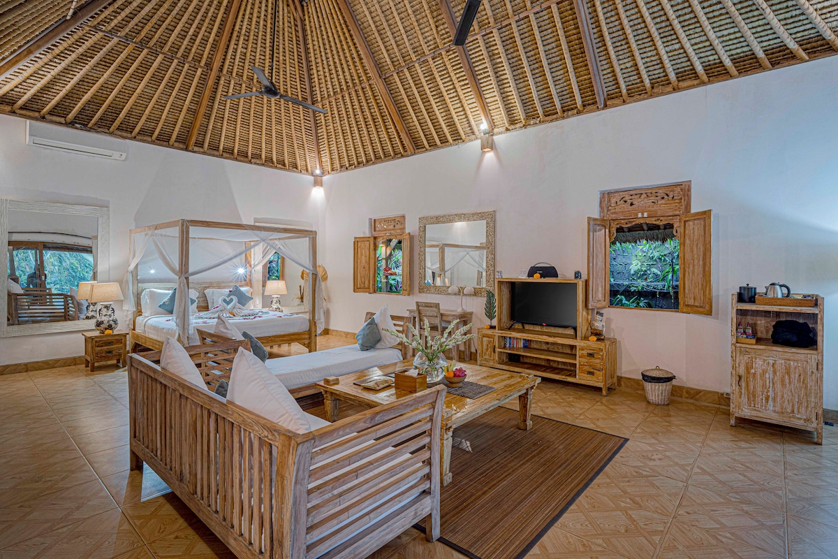 Authentic remodeled old Javanese house nestled in immensely beautiful nature location 4km north of Ubud with spectacular views over lush tropical jungle to Batukaru volcanoes ⛰️⛰️⛰️ Unique sanctuary where it feels like 20 years back in Ubud, where you could relax, rejuvenate,practice yoga & meditation,receive healing massages or sound bath with antique Nepali singing bowls ,enjoy homemade high vibes healthy food and connect to nature which feels very vibrant in every single grass 🌱