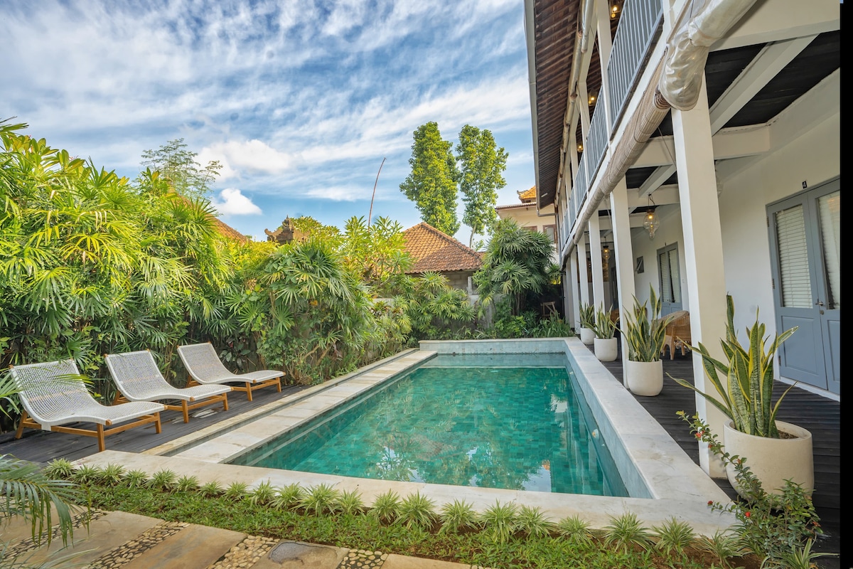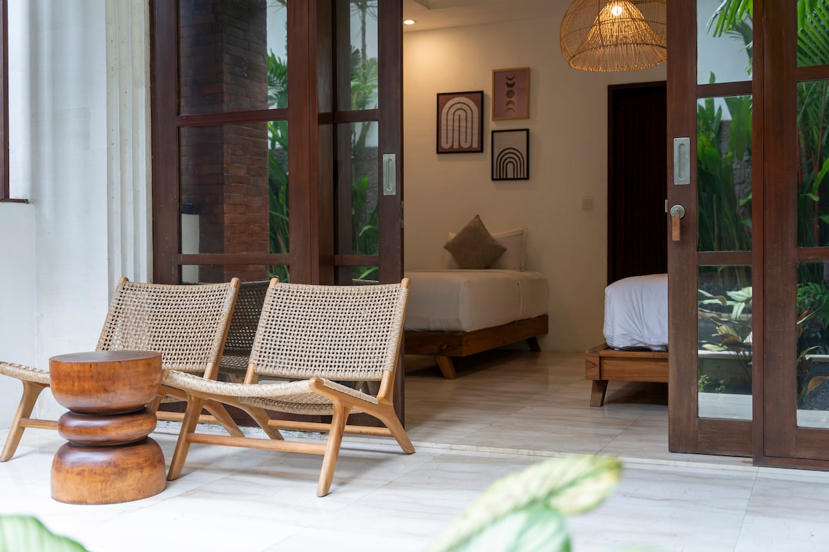 Experience your 130m² villa blending Japanese minimalism, Peranakan heritage, and Balinese warmth. Enjoy complete privacy with cozy living room, pantry kitchen, 2 bathrooms with bathtubs, and private pool with loungers. The only shared spaces are our serene garden featuring a majestic tree beside a traditional Balinese prayer stone. Perfect for up to 3 guests. Every detail enhances your connection to Bali's serene environment.
