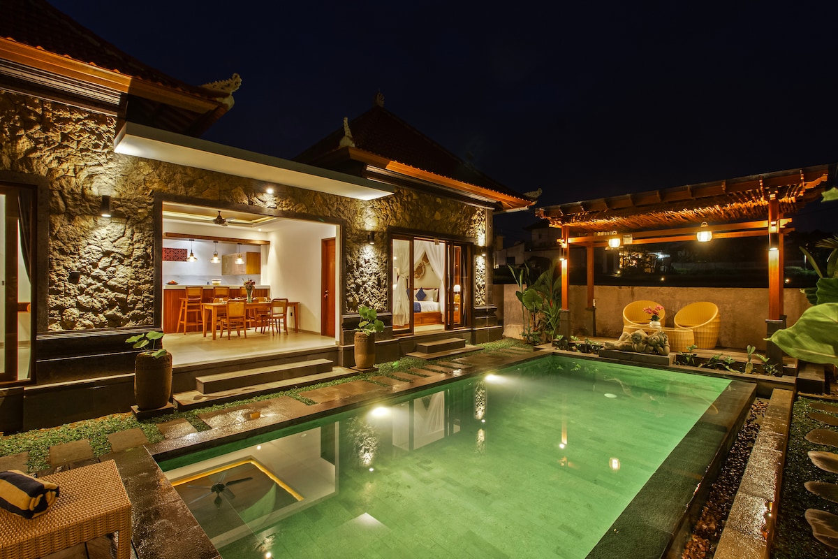 Luxurious private villa with 6x3 meter pool. Secure, private, safe. Lush garden and sheltered but open air kitchen for dining and relaxing by the pool. Queen bed, outside tub and shower, with fish pond view, fully equipped kitchen. AC, TV, great WiFi, daily cleaning and set breakfast is included. We are an 8 minute walk from the main road, or a short scooter ride. This means peace and quiet, and no car noise. Our staff will be happy to drive you in by scooter if needs be.