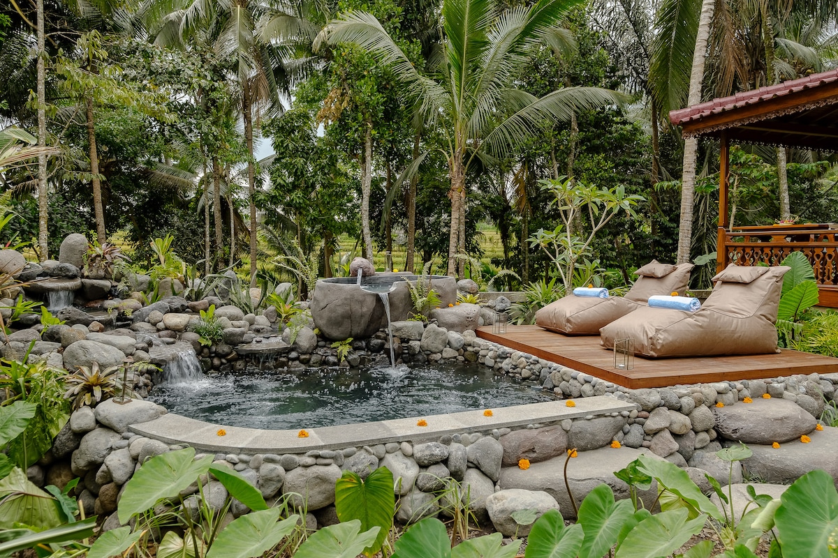 Escape to your own private jungle villa with pool, a secluded sanctuary where luxury meets nature. The Love Ashram is a romantic retreat for deep relaxation & connection. Surrounded by lush greenery, enjoy privacy, jungle views, & a peaceful atmosphere-ideal for couples, honeymoons, & nature lovers seeking a serene escape in Ubud. As part of the living landscape, the rice fields surrounding the villa move through natural cycles—seeded, growing, & harvested—so views may vary throughout the year.
