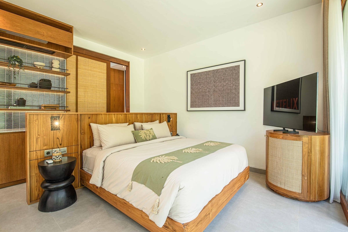 Discover our luxurious one-bedroom villa, perfect for an unforgettable stay. The king-size bed ensures restful sleep, while the outdoor gourmet kitchen inspires your culinary skills. Relax on the spacious terrace and enjoy the infinity pool over a picturesque stream. The quiet location directly in the rice fields offers absolute privacy and peace. The modern Balinese style of the villa combines luxury and culture for a unique experience.