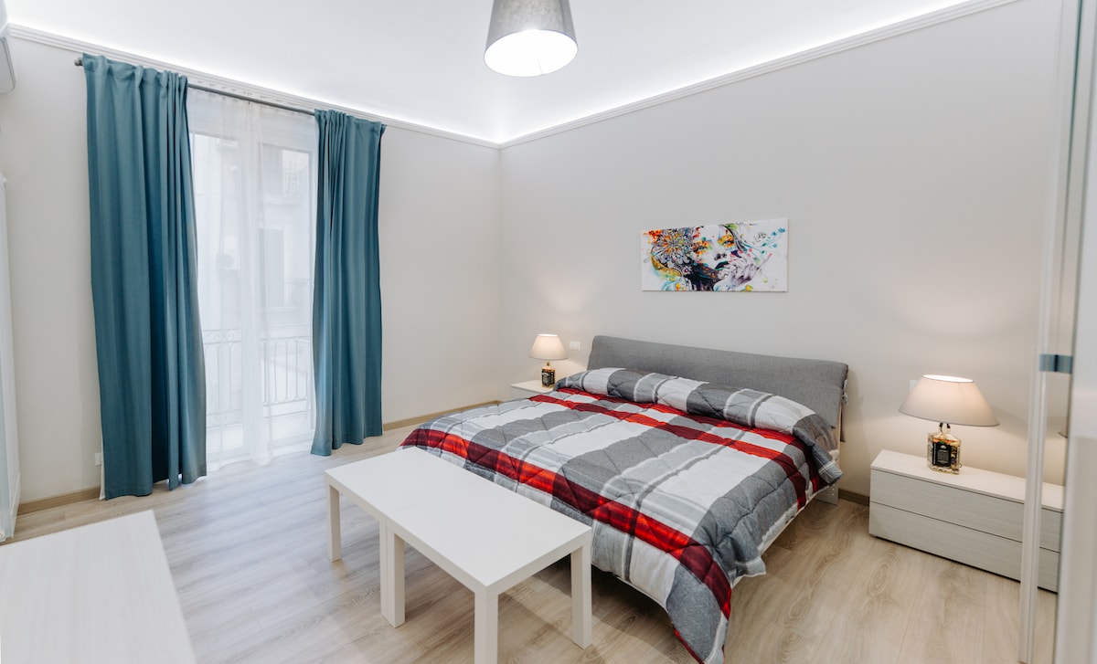 In pieno centro, in un elegante palazzo storico dei primi del 900. Appartamento luminoso, accogliente e dotato di ogni comfort. Un grande soggiorno open-space con divano, angolo studio, tavolo da pranzo e cucina a vista con penisola. 2 camere da letto e 2 bagni. L'appartamento ha 2 balconi, con un tavolino bar e due sedie. Ideale anche per soggiorni lunghi o per viaggi di lavoro. Nel quartiere locali, ristoranti e negozi. Raggiungibili a piedi tutte le principali attrazioni della città.