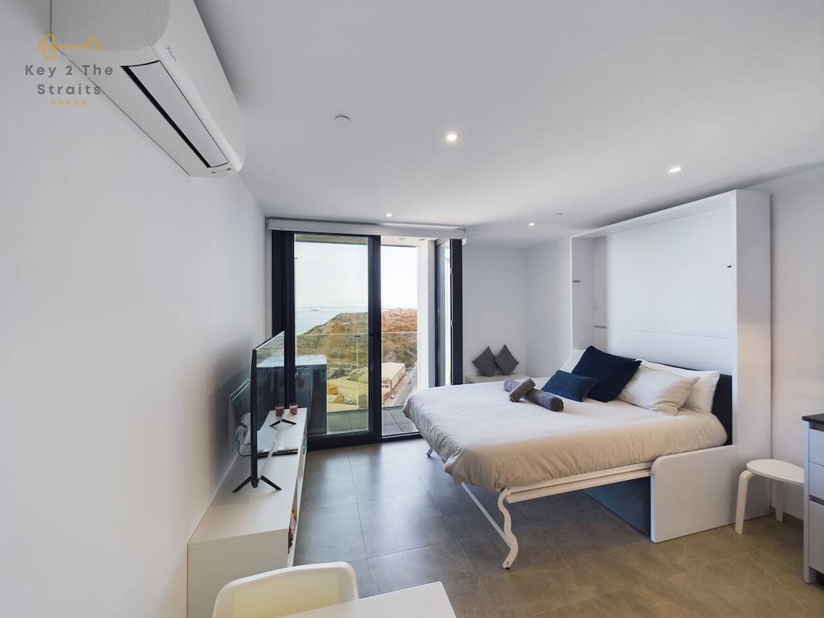 Enjoy a stylish stay in this ‘Presidential Suite’ at E1 Suites & Spa, just minutes from Eastern Beach. This fully equipped, high-spec modern apartment boasts stunning views across the Mediterranean and Spain. Guests can access the gym, pool, and spa for an additional cost, payable directly to the onsite facilities. Gibraltar Airport, the town centre, and the marina are all within a 15-minute walk. Start your day with breathtaking sunrises from the spacious balcony.