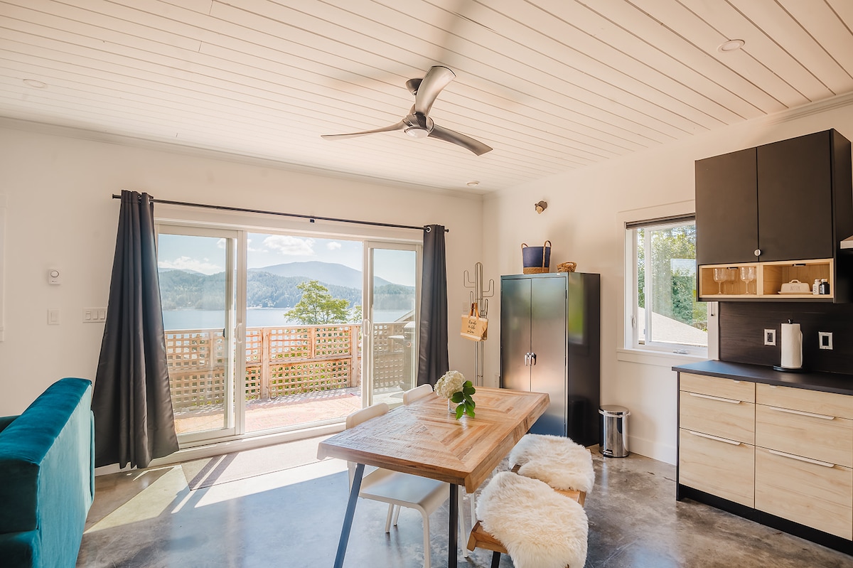 Private ocean view open concept studio cottage in the heart of Lower Gibsons. Open living space with gas appliances, washer & dryer and ocean facing deck. 5 minute walk to all Lower G has to offer; Beach, Marina, Restaurants, Markets, Brew Pubs and a Yoga Studio at the end of our block. An E car charging station available upon request. The deck is private with BBQ. Parking is directly beside the cottage. NOTE: This property is designed for adults only and not suitable for children under 16.