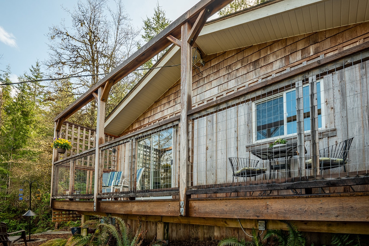 A very short drive or walk from the Langdale Ferry Terminal, this rustic 2 bedroom, loft w/sauna home is the perfect spot for a weekend getaway or long stay retreat! Located on a very steep 3/4 acre property, you will be surrounded by nature. Deer, birds and the occasional black bear will delight you if you are quiet and patient. Just a four minute walk to Hopkins Landing, where a dock and sandy beach await. It’s the perfect place for kids of all ages (and their dog!), to play or just relax!