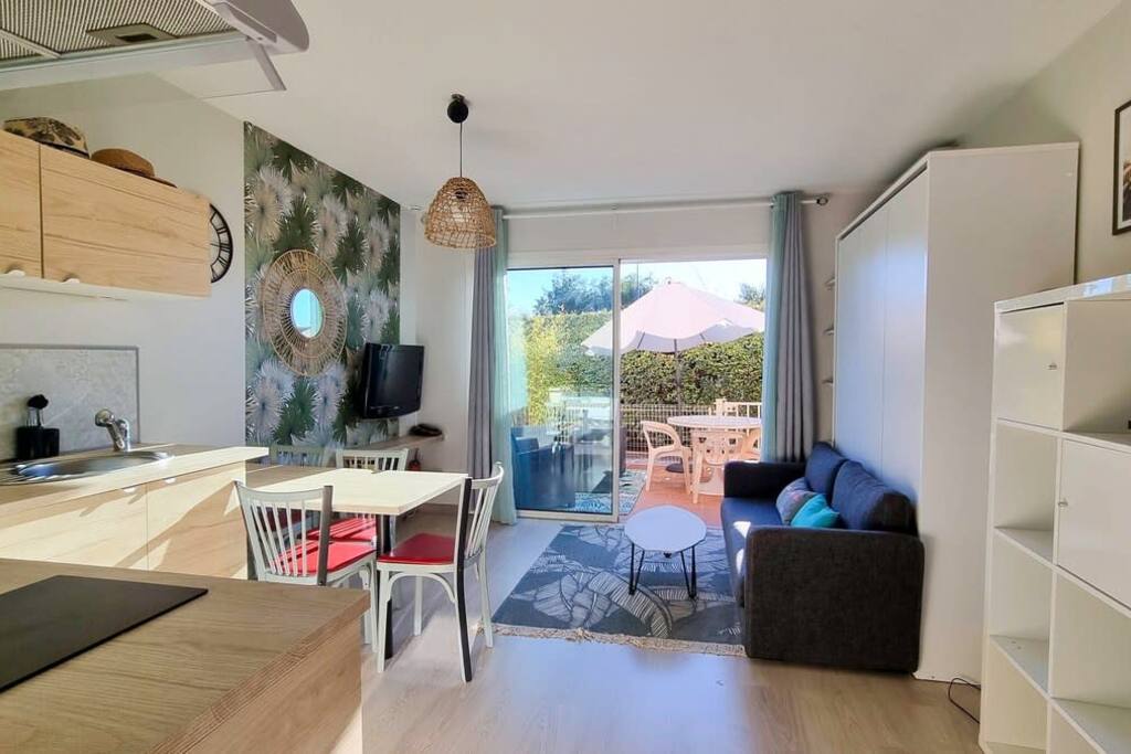 Un séjour sur la plage, une grande terrasse pour prendre vos repas au calme ou vous faire bronzer au soleil face à la mer avec une vue sur les iles, un jardin ombragé pour faire la sieste, un emplacement idéal pour des vacances privilégiées. l'appartement de 28 m2 a la vue sur le jardin , avec cuisine aménagée, une chambre indépendante avec salle d'eau intégrée dans la chambre ( douche à l'italienne et lavabo ) et WC séparé. Place parking réservée fermée par portail automatique.