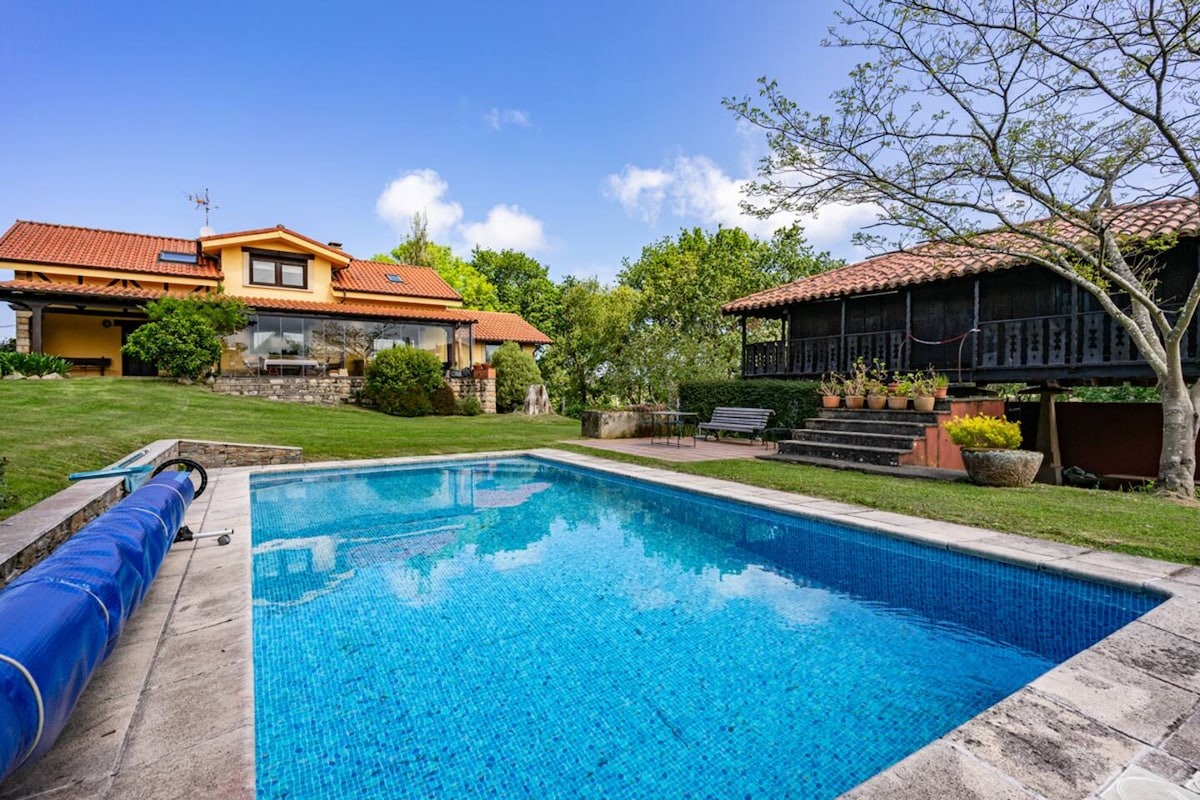 Bienvenidos a Villa Birdie, una casa de campo en plena naturaleza a solamente 15 kms por autopista de Oviedo y Gijón De estilo inglés, es una casa de muy amplias dimensiones en una finca de 3300m2. Aloja cómodamente a 17 huéspedes en sus 8 dormitorios. Piscina (con valla de seguridad) de uso exclusivo de los huéspedes. Equipada con chimenea de leña, barbacoa, lavadora, secadora, WIFI, smartTV, sala de juegos de niños, ping pong etc