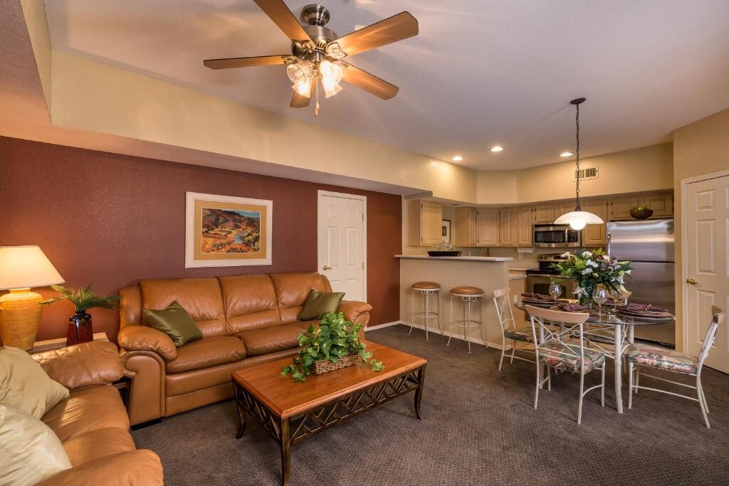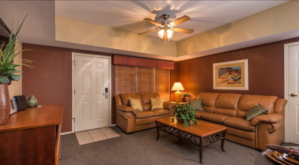 Bison Ranch features spacious two-bedroom resort suites that comfortably sleep up to six guests. You are sure to appreciate the privacy of separate bedrooms, the economy of a fully equipped kitchen, the convenience of a washer/dryer, and a gas fireplace for chilly nights. Plus, a living/dining area and TV and in each bedroom, and barbecue grill are all amenities you just won't find in an average hotel room. Relax, sit back and enjoy the view from your private balcony in this Arizona paradise!