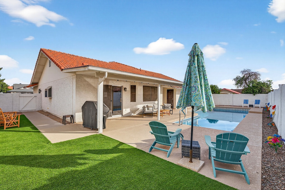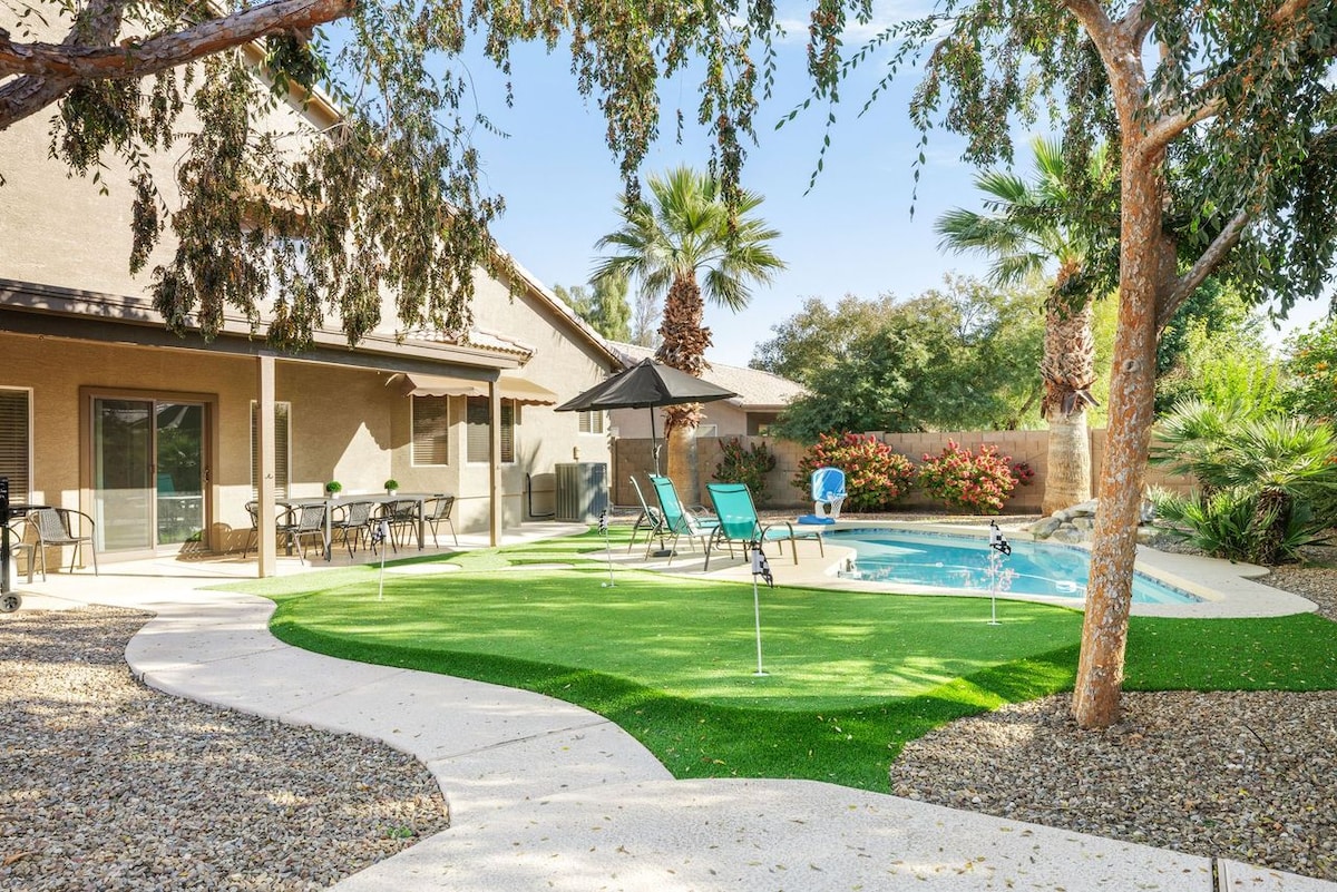 So much room for activities! Our reviews say everything. Everyone loves this gorgeous 5BD/3BA home. Heated pool & spa. Well-equipped chef's kitchen. Dedicated work space & gigabit Wi-Fi. Kid & dog friendly. Sleeps up to 12. 4 TVs w/ free streaming. Gas fireplace, BBQ, table tennis, PAC-MAN, cornhole & tons of games. Quiet neighborhood w/ parks & playgrounds. Near Gilbert Heritage restaurants. Don’t miss the farmer's market. Family fun. Memorable meals. Celebration. Relaxation. All for you.