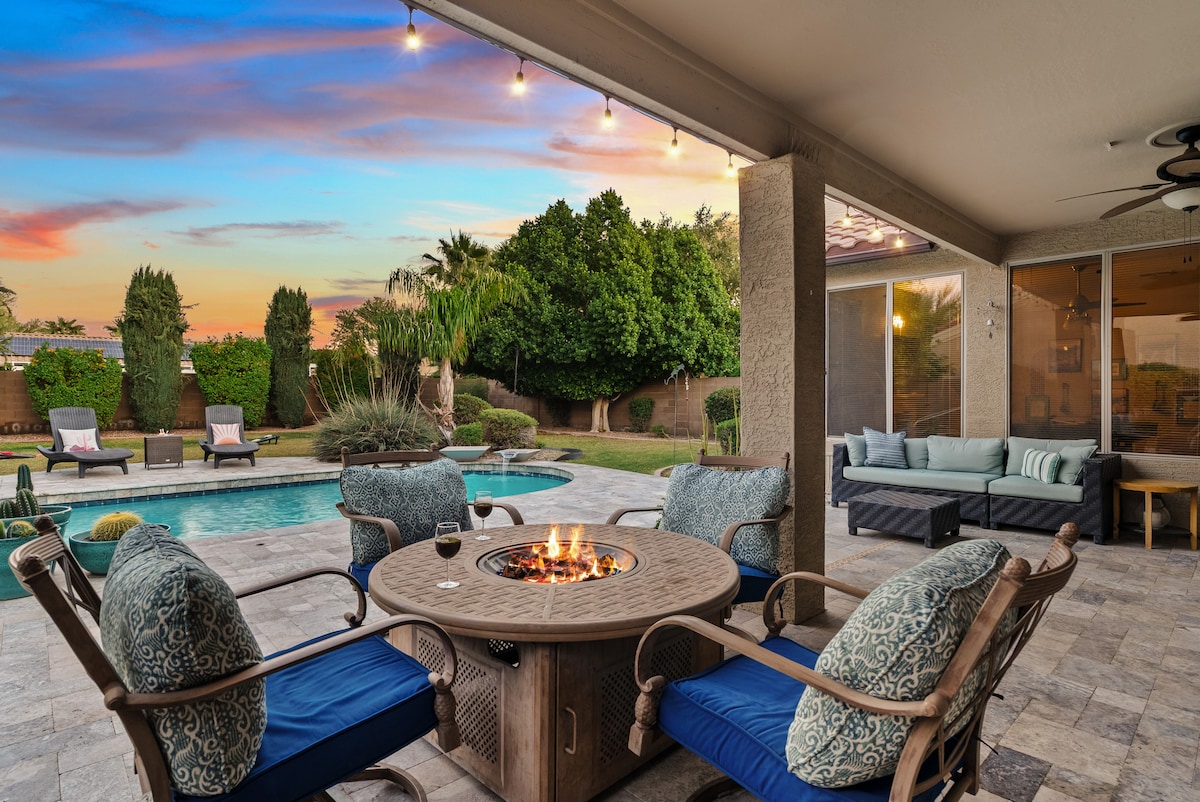 Gilbert Downtown famous restaurants are close by. This house is truly an entertainment paradise. The thought put into the theming will surprise you. Backyard features cornhole game, air hockey table, fire pit, BBQ, Swim Spa, Hot Tub, string lights, seating area pergola & much. Three bedrooms, 2 king beds and 2 full size beds. Large flat screen TV's, fireplace, family room, dinning, living room, arcade room, 2-1/2 bathrooms, washer & dryer, outdoor counter tops, quartz counter tops.
