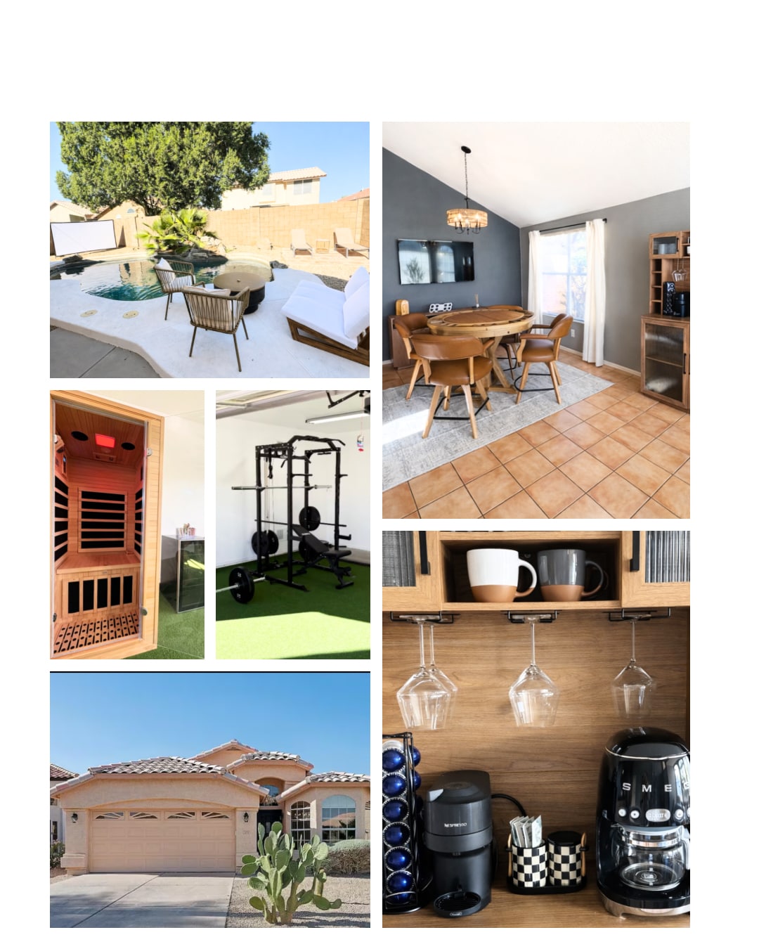 Gilbert Downtown famous restaurants are close by. This house is truly an entertainment paradise. The thought put into the theming will surprise you. Backyard features cornhole game, air hockey table, fire pit, BBQ, Swim Spa, Hot Tub, string lights, seating area pergola & much. Three bedrooms, 2 king beds and 2 full size beds. Large flat screen TV's, fireplace, family room, dinning, living room, arcade room, 2-1/2 bathrooms, washer & dryer, outdoor counter tops, quartz counter tops.