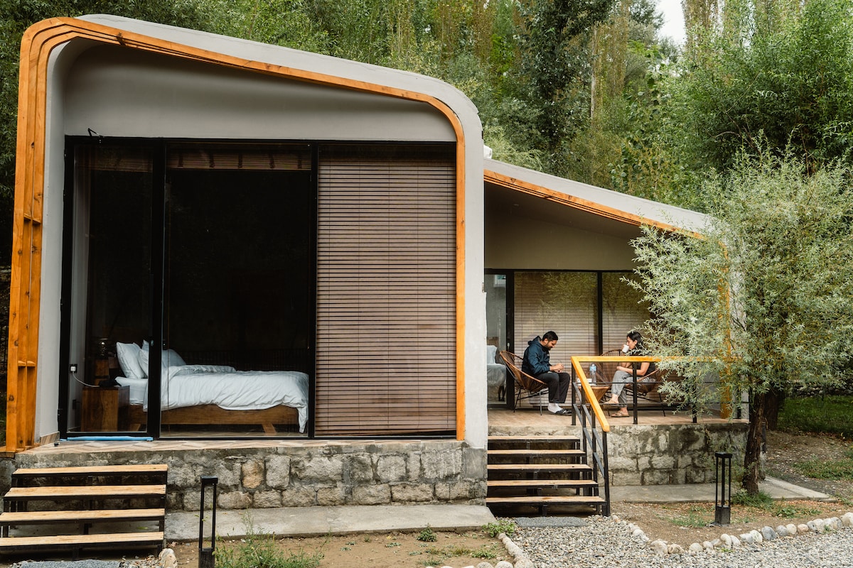 Enjoy a soulful stay at this family-run boutique retreat in the heart of Hindukush. Named after the beautiful untouched Ghamubar meadows, this cottage is one of Rustagaarii's most premium lodging option. Ghamubar Features: 1. 2 bedrooms 2. King bed Master bedroom + twin bedroom 3. Private bathrooms with each room 4. Jaccuzi in Master bedroom 5. Skylights over beds and floor to ceiling windows 6. 24/7 running hot water 7. Heating & Cooling in the rooms 8. Heating in the Bathrooms
