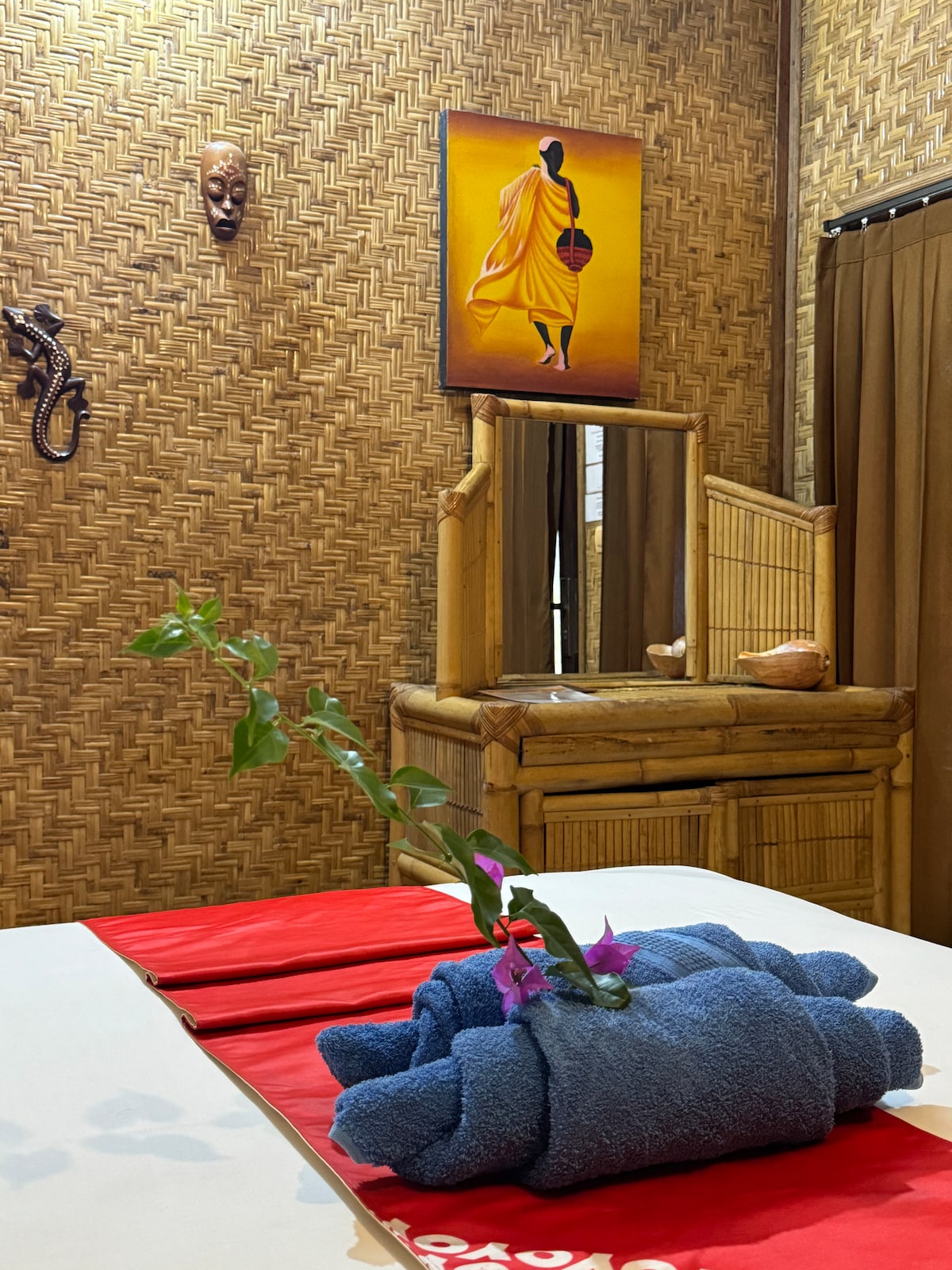 This charming bungalow 🏡 features a hot & cold tropical outdoor shower with strong water pressure & reliable air conditioning ❄️. A king-size bed & dressing table 🪞 . Fast Wi-Fi (45 Mbit/s), all-you-can-eat breakfast 🍳🥞, a cozy terrace. 50m to the co-working space, which can be transformed into an open-air cinema 🎥🍿. Relax in the hammock with views of palms & tropical garden 🌴🌺. Daily cleaning. 🧹 Fresh towels on request 🧺. Tips on 🤿 spots, cafés & sunsets 🌅. Staff always on site ℹ️