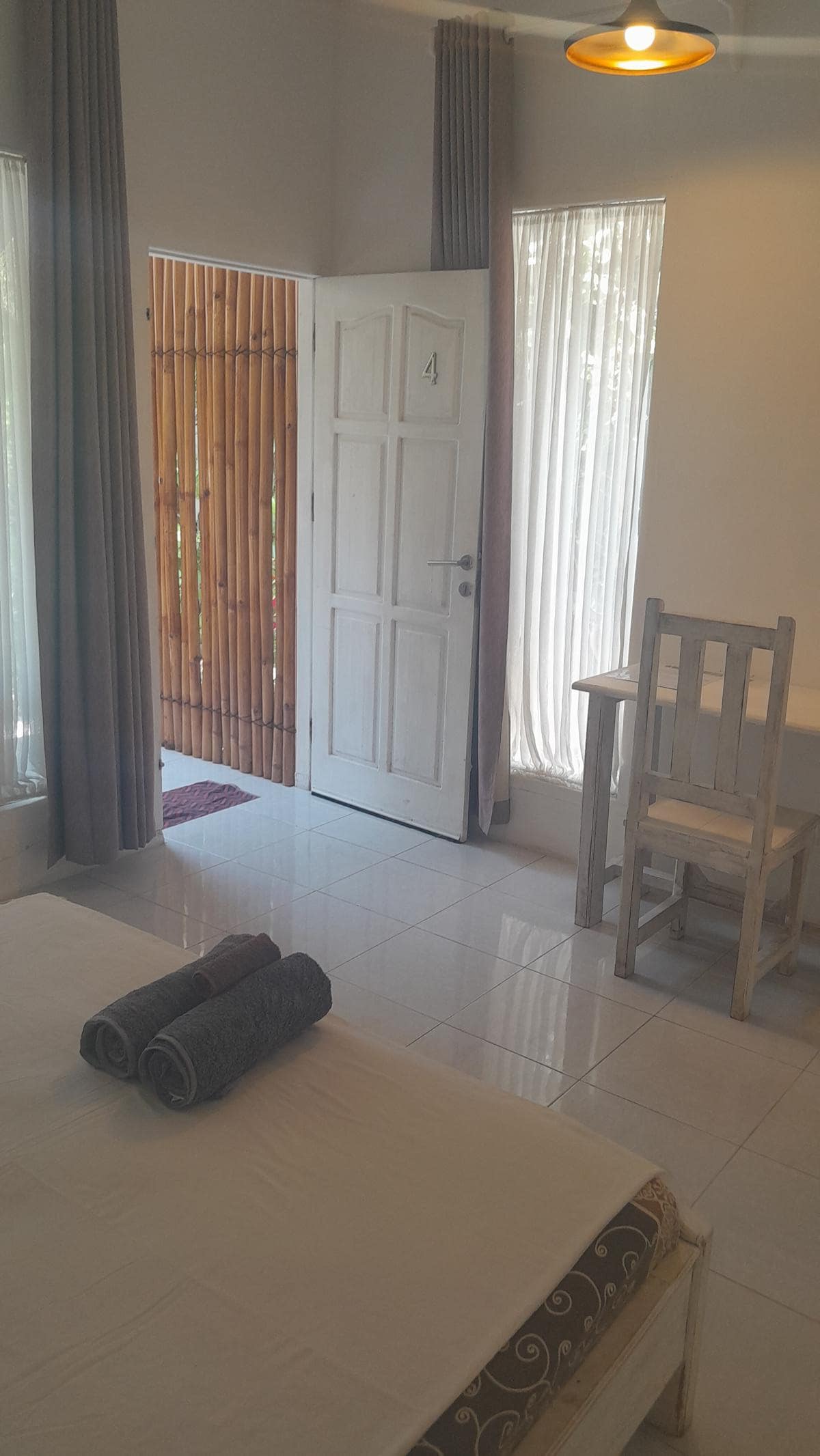 Each room has a double bed, air condition, open air bathroom with hot fresh water and towels are provided. The bungalows have a full, curtained glass frontage. Outside is a private covered porch area with table and chairs overlooking the quiet coconut garden.
