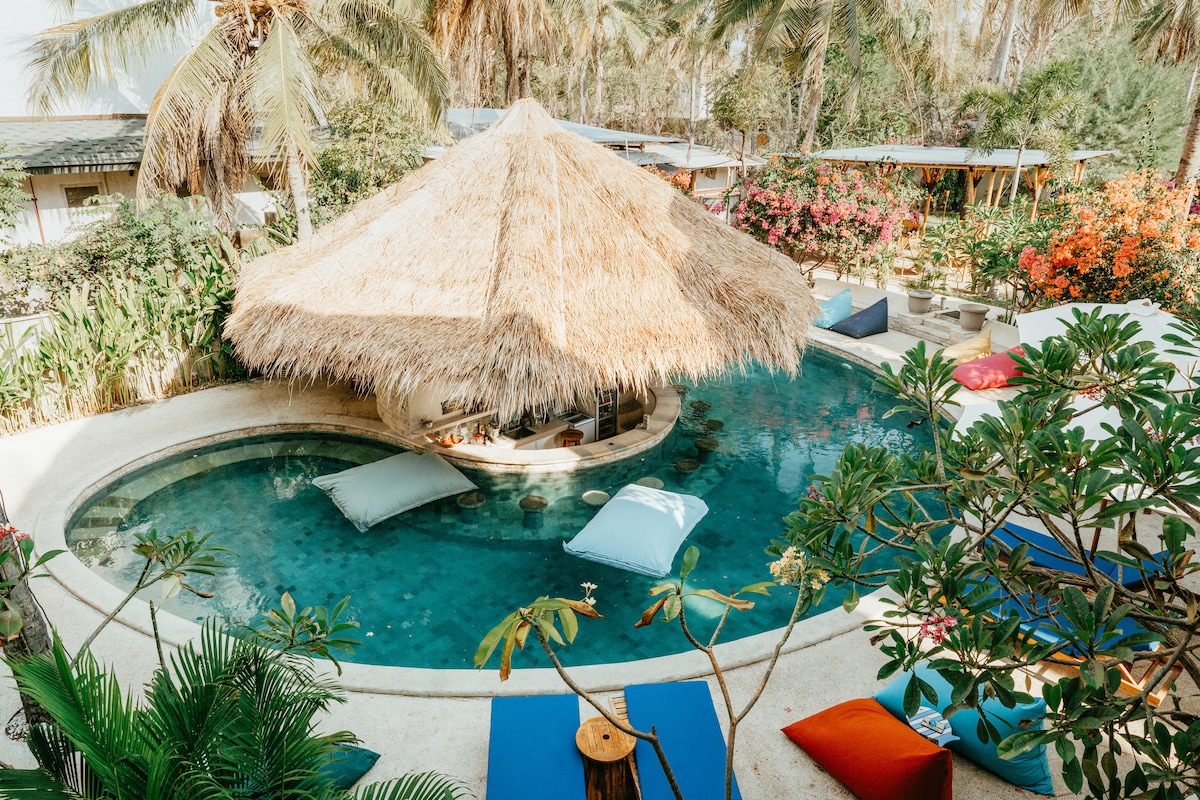 A tropical Island resort gently hidden among the coconut tree groves of Gili Trawangan Island — just a stone's throw from Bali. Away from the busy main road, yet within a 10 minute bicycle ride to the town center or a 3 minute stroll to the sunset beach. Inspired by Balinese architecture. All rooms are air-conditioned, come with an en suite open air bathrooms, fresh hot water shower and a king sized bed. From 7:00 A.M. we serve an à la carte breakfast. Always included with your stay.