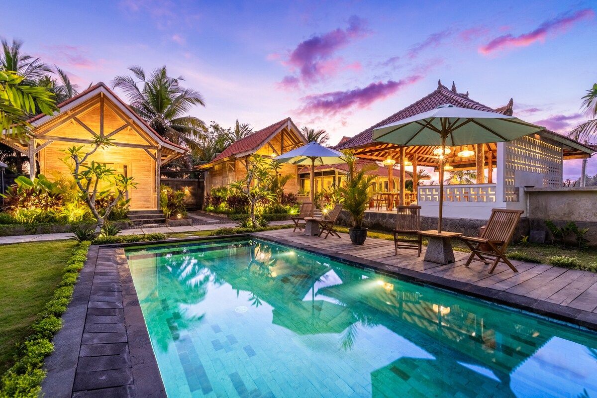 3卧室私人Joglo别墅-海滨和泳池