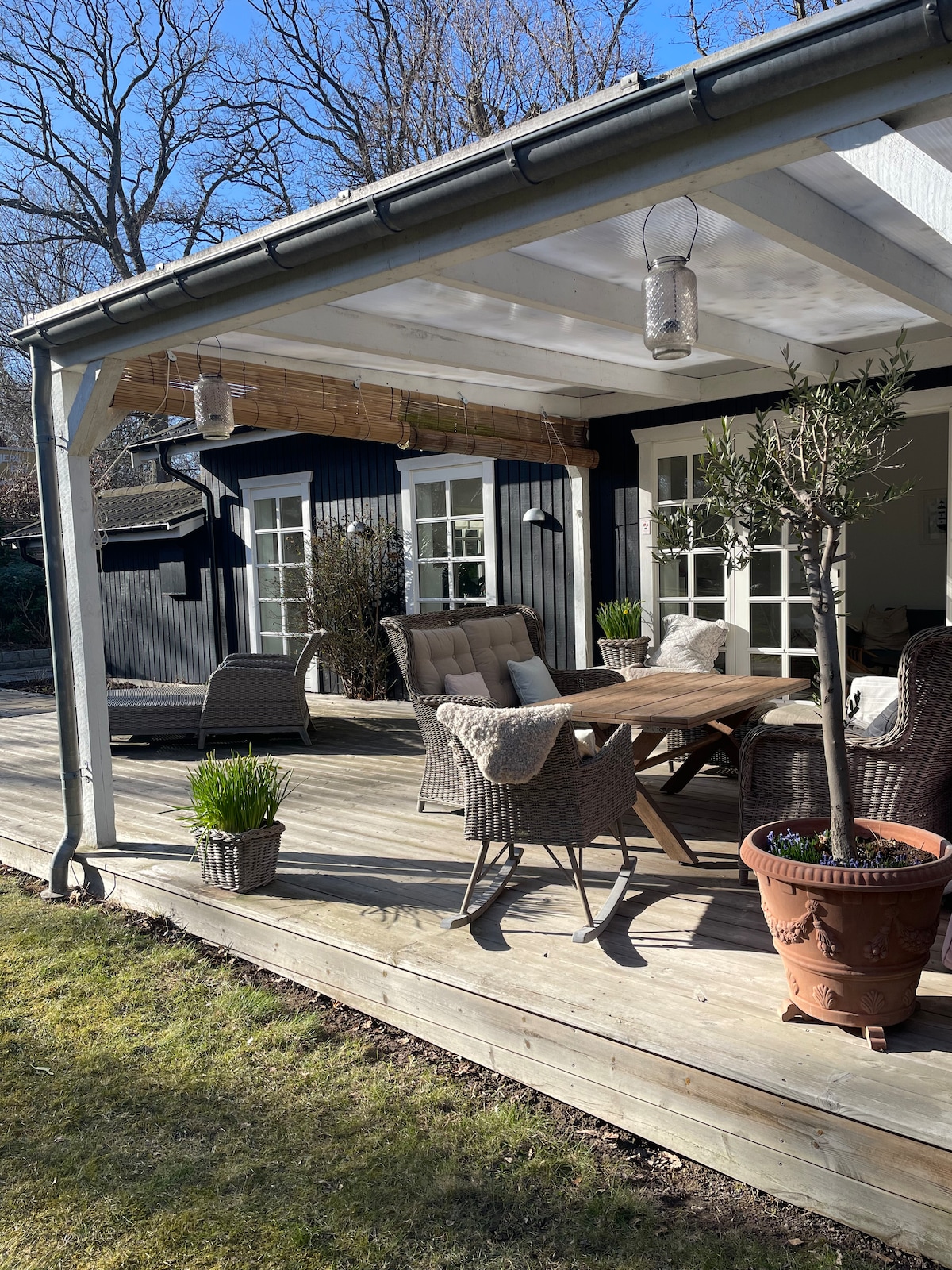 Wonderful vacation house situated a stone's throw from the water and the beach. Literally speaking! Here you can wake up to the gentle sound of the waves, almost calling your name, if you feel for a morning swim. On warm days, you can enjoy meals on the terrace most suitable to enjoy both the morning sun and also a beautiful view to the sunset. The high roof inside creates a good and spacious feeling making it easy for family and friends to enjoy life together during all times of the year.