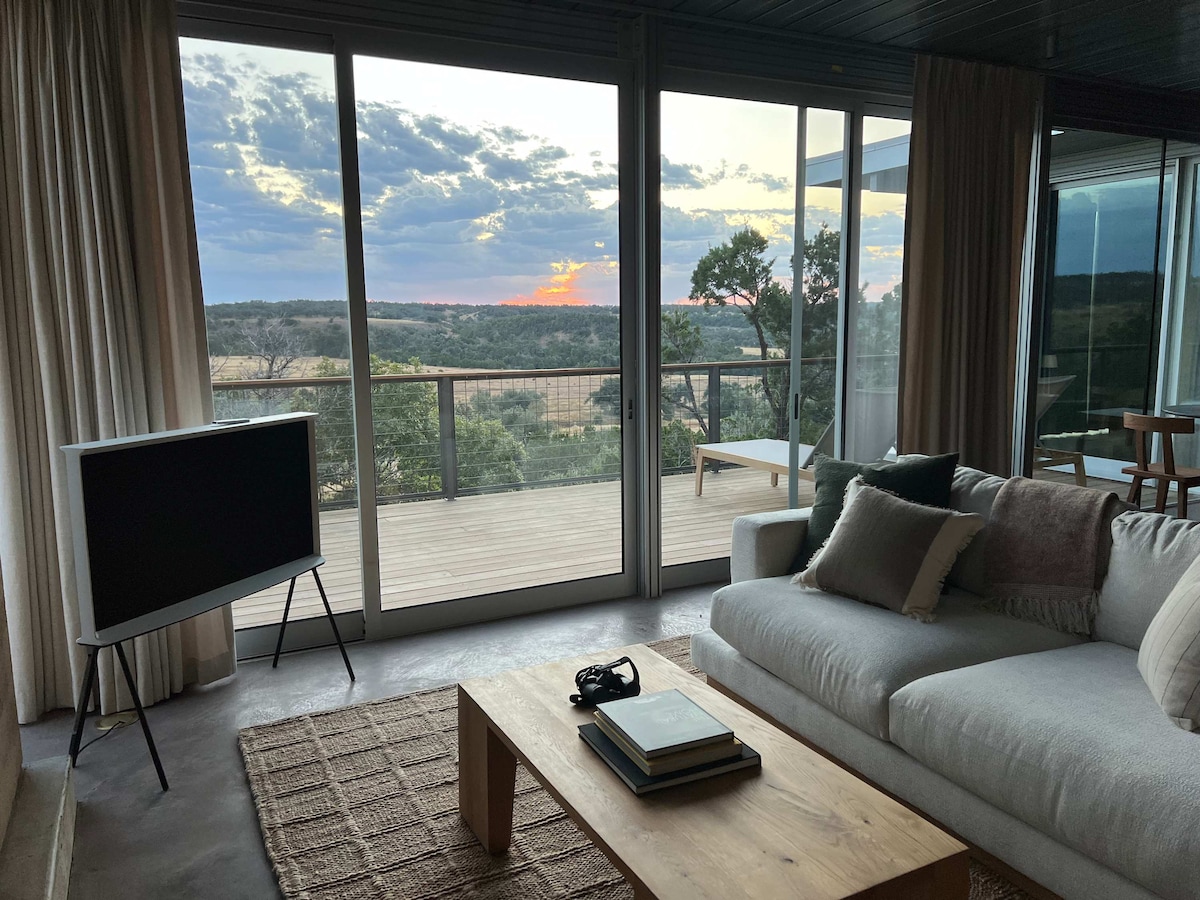 The Pedernales A-Frame epitomizes luxury... Nestled on an expansive 8-acres bordering the serene Pedernales River and positioned atop a tranquil hill, this cabin boasts sweeping vistas of the picturesque Texas Hill Country. Its interior exudes opulence with exceptional craftsmanship, acclaimed design, premium amenities, and a wealth of luxurious finishes that cater to even the most discerning tastes. We look forward to having you...