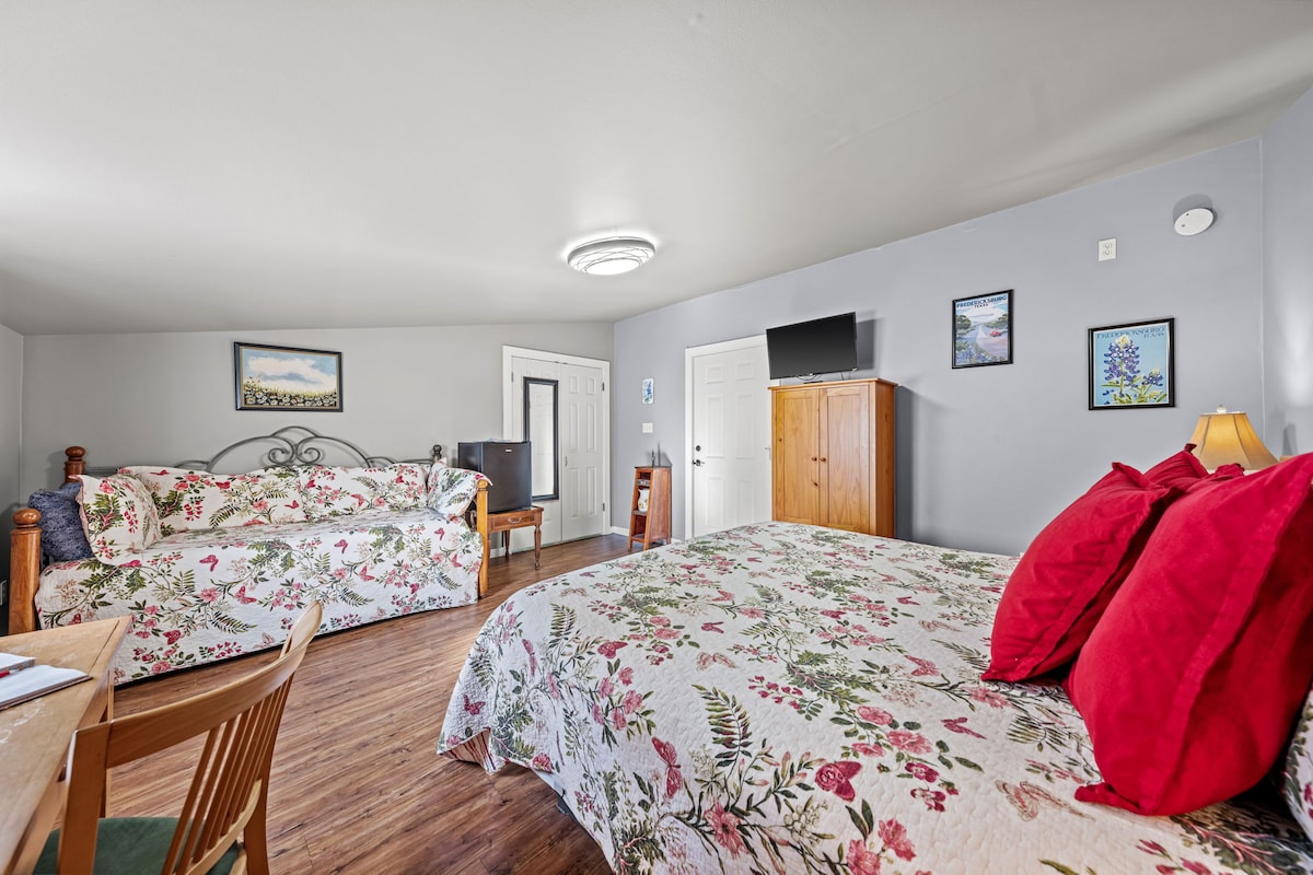 The Texas Wildflower room at Full Moon Inn, across from Luckenbach, TX, offers a spacious king bed, private ADA-compliant bath with tub/shower, plus a twin daybed with trundle for 2 extra guests. Enjoy a FREE delicious HOT BREAKFAST and BOTTOMLESS MIMOSAS served daily in the dining room / bar area. Perfect for families or groups seeking comfort and accessibility in a peaceful Texas setting.