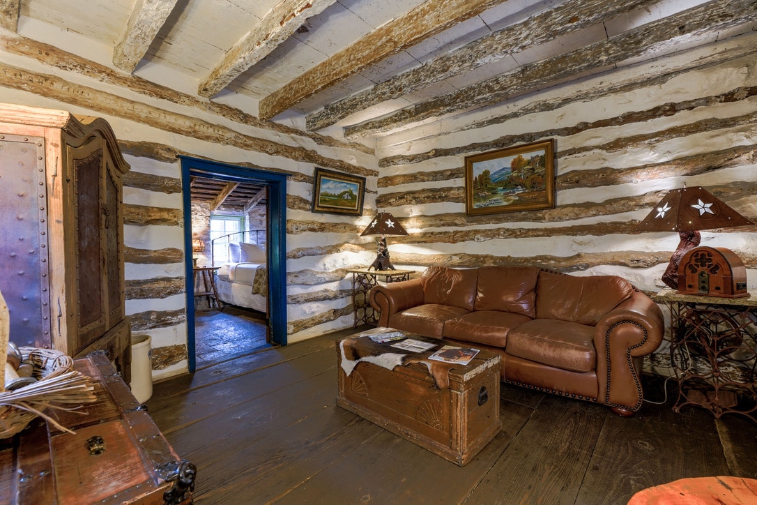 Built by German settler Gerhard Rorig in 1846, this cabin served as a Sunday House. Sunday Houses were a second home where men stayed on weekends after a night of drinking with their friends. They were located near a church, so they could attend church on Sundays. This cabin was later added on and renovated by Johann Loeffler and his son-in-law J. Charles Weber. The home stayed in the Loeffler-Weber family for 90 years. Then George and Gloria Hill bought and restored it in the 1960s.