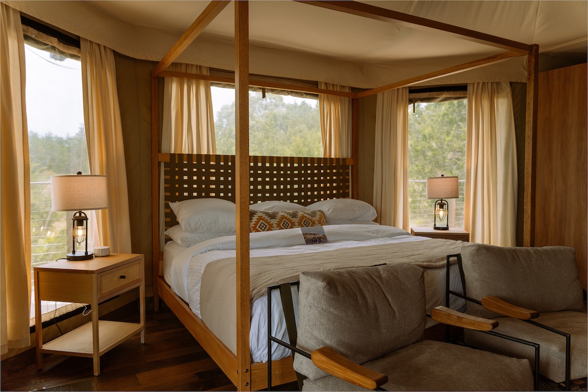 Welcome to your spacious Glamping Lodge. The main tent features a king bed, kitchenette, and full bathroom. A separate bedroom with two single beds is perfect for the kids. Your private deck has a cozy seating area and a Solo Stove fire pit. Enjoy a rustic-luxury escape on our 34-acre retreat with access to our bar, games, and nature trails.