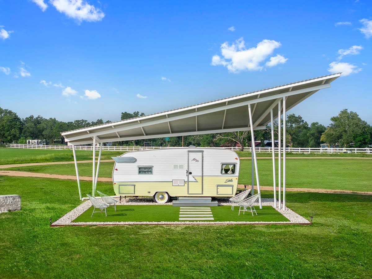 Treat yourself to a peaceful, fun-filled glamping getaway with Miss Lottie, a reissued 1961 Shasta that's part of the Palm Springs-inspired Blue Skies Retro Resort. This resort has everything you need to unwind, including fantastic vintage decor, an outdoor community pool, a shared gas grill, and a pavilion with an outdoor fireplace. Enjoy a separate, private bathroom suite, complete with a bathrobe, and rinse off under the vast blue Texas sky in your very own outdoor shower.