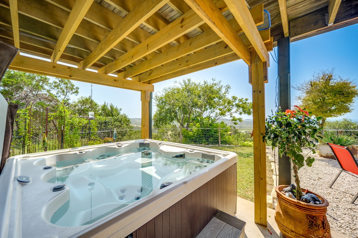 Welcome to Twisted Oak. You won’t want to leave this charming, one-of-a-kind, peaceful Texas property. Enjoy the dark starry night skies while soaking in the private hot tub! DEER, turkey, and authentic free-range Texas Longhorns roam the open scenery. Come pet the horse's noses! Complete with cozy bed, fully stocked kitchenette, and large bathroom. Very scenic drive to FBG. This rustic, refined cabin gives you a taste of Hill Country hospitaliy. Getaway location 💕 Relax and watch the DEER!
