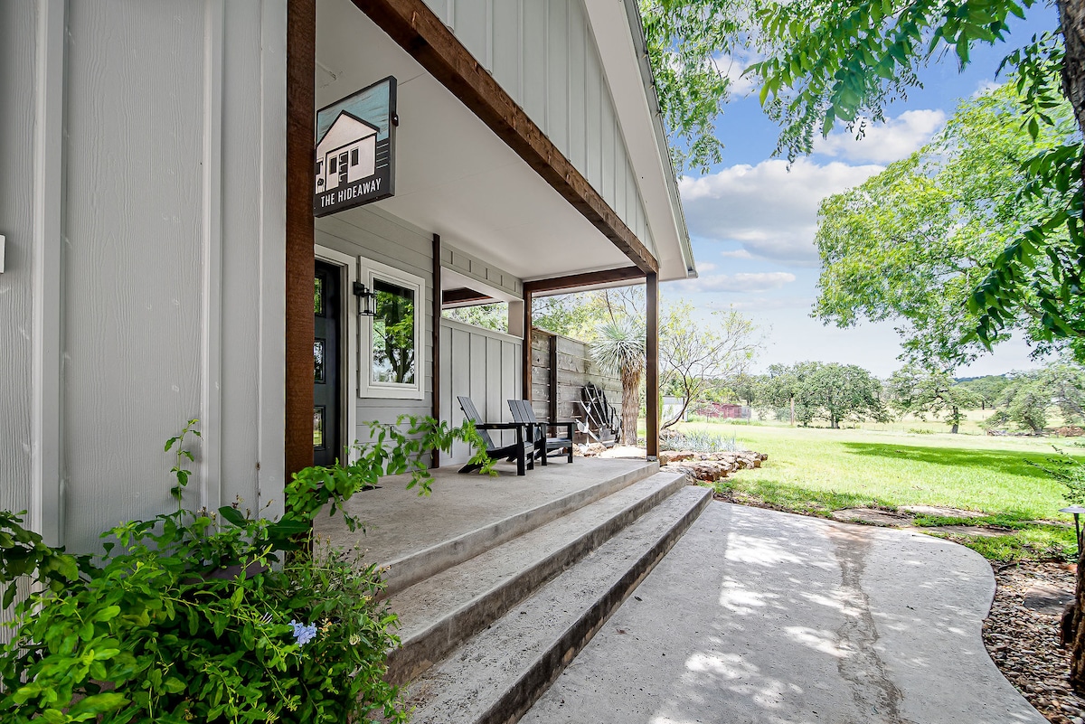 Escape to The Hideaway, a modern ranch-style guesthouse designed for comfort and style. Relax by the double-sided fireplace, soak in your private hot tub, or unwind beneath the stars by the fire pit. With a king bed, vaulted ceilings, and a private courtyard, this boutique retreat offers the perfect balance of seclusion and proximity to Fredericksburg’s wineries, restaurants, and Main Street.