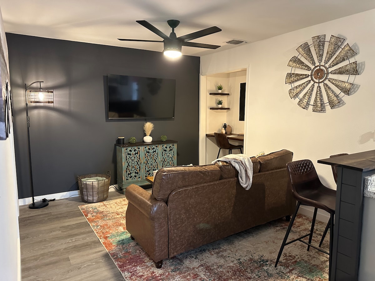 Newly-built and ready to welcome guests, The Orange Cactus Casita is a private guest house situated on 10 acres of land. Sit back, relax and enjoy the views. This 2 bed, 2 bath guest house has everything you need including a full kitchen, living room and outdoor living space. This location offers the perfect opportunity for genuine relaxation in a countryside atmosphere, all within a quick 15-minute drive to Main Street.
