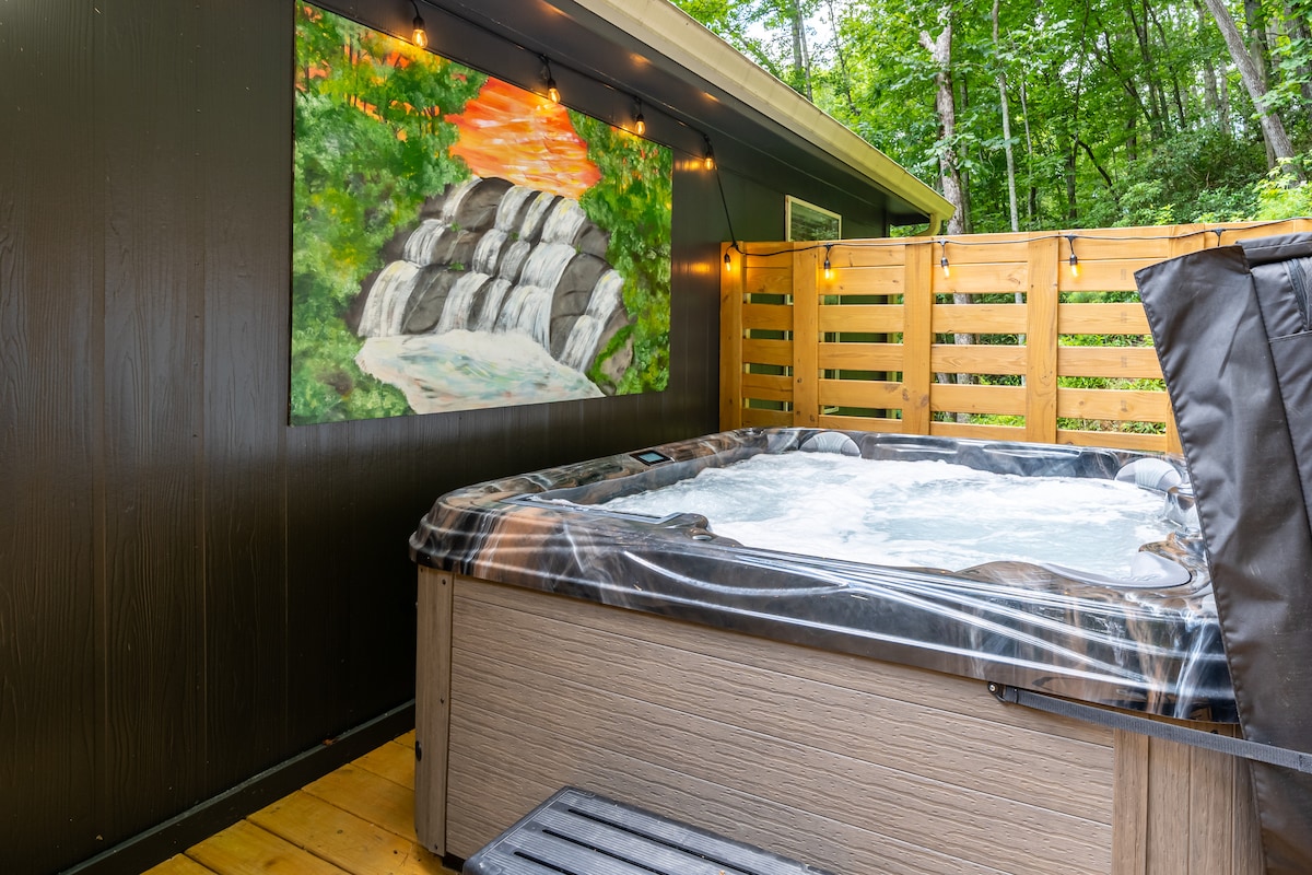 全新现代小木屋,带 95 英尺高空滑索和热水浴缸