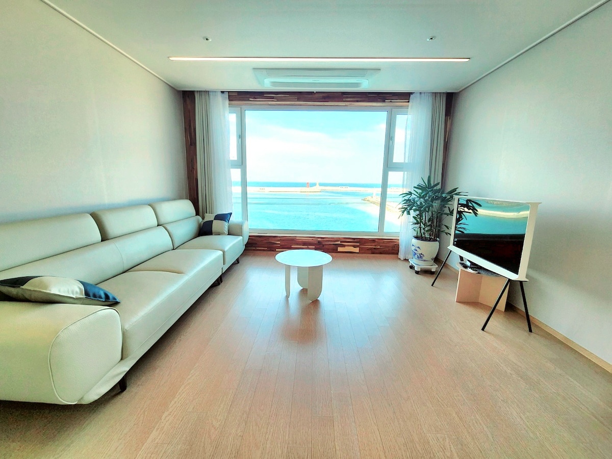 2023 Grand opening, E7 in Jukdo. -One Studio Room (Double bed) -Just in front of Dongsan Beach, 10Sec from the Beach -Check In from PM4:00 -Check Out by AM11:00 -3Min by car from Jukdo Beach, Ingu Beach -15Min by car from Jumunjin Beach, BTS MV location -30Min by car from Kyungpo Beach, Sok-Cho and Seolak Mountain. -Refrigerator, Electric range, Microwave, Dishware, Pot, Frying pan -Shampoo, Hair conditioner, Body shampoo, Tower -Smoking is prohibited in room Thank you:)