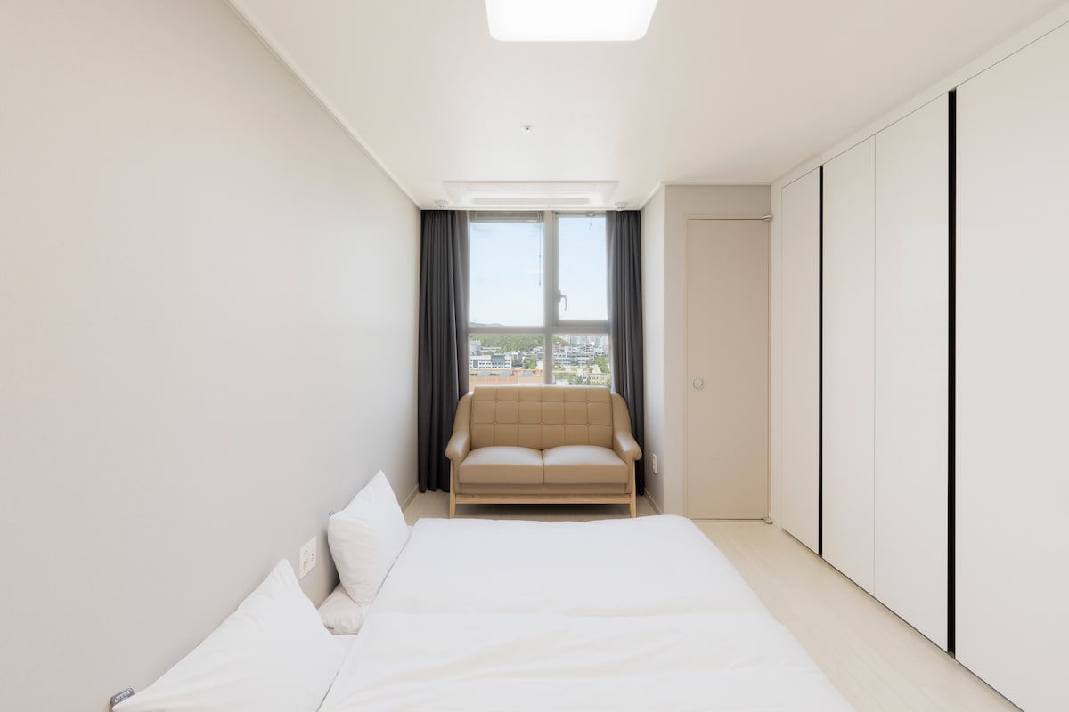 Welcome to "SurfingStay" Reservation is required in advance for free rental of a surfboard and 2 boogie boards. Bedding for an additional person besides the capacity of 2 is requested in advance if necessary Queen bed Area:34M2 You can enjoy the panoramic ocean view from the 19th floor while lying in bed. You can also lie in a hammock and enjoy the sunrise and sunset. You can rest and heal while taking a walk along the beach to Jukdo hermitage.