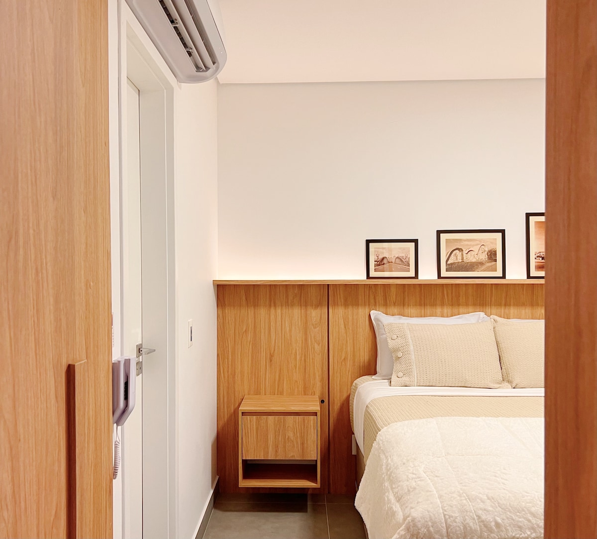- Flat dentro de Apart Hotel/Residence com uma vaga - Limpeza diária (serviço não inclui lavagem de louça) - Wi-Fi gratuito - TV a cabo - Ar condicionado - 1 Cama de casal Queen com box - Roupas de cama e banho inclusas - troca semanal para permanências superiores a 7 dias (contribuindo com o meio-ambiente, não fazemos trocas diárias) - Copa equipada com frigobar, micro-ondas, cafeteira e utensílios (pratos, copos, talheres) - Secador de cabelos - Ferro de passar portátil - Papel higiênico