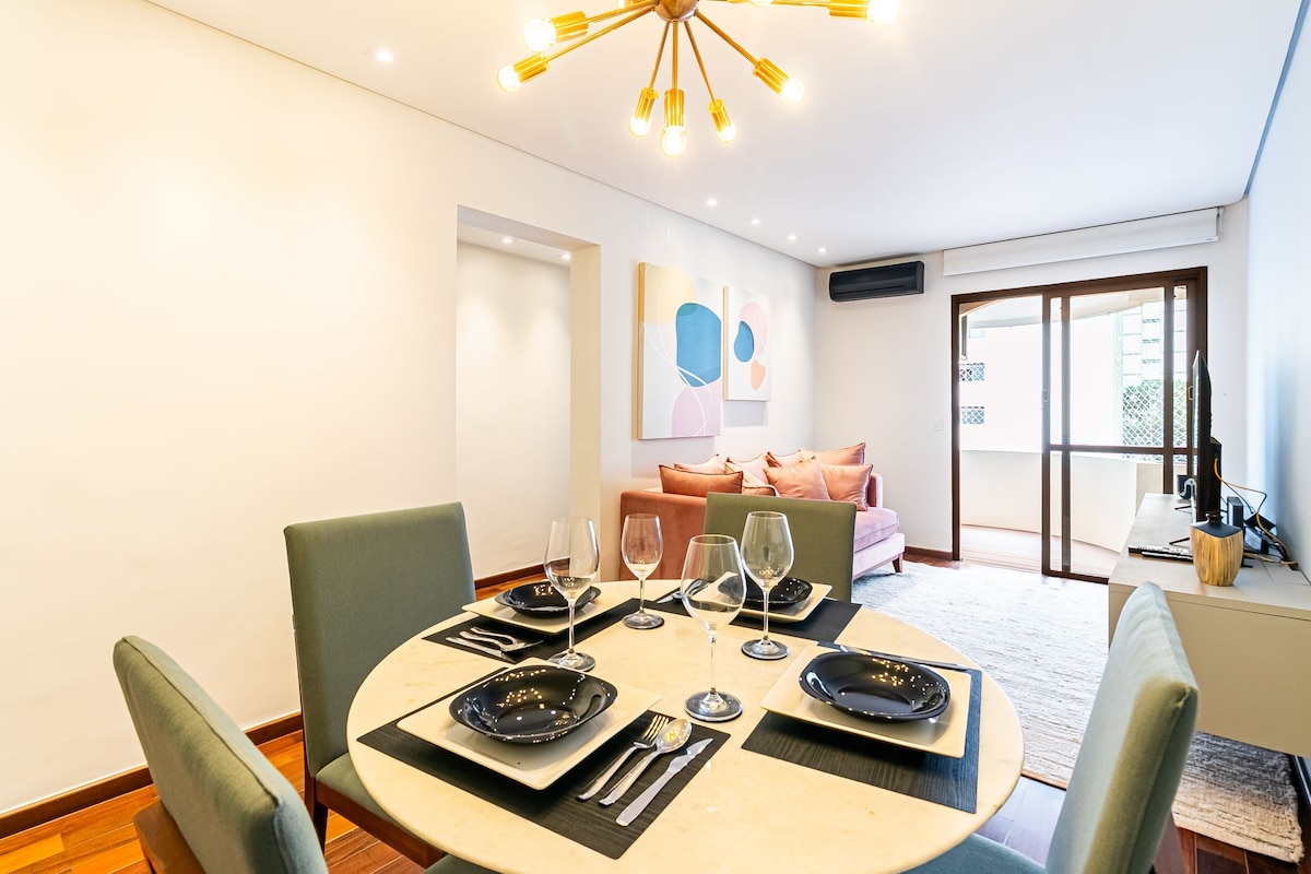 Localizado nos Jardins, o bairro mais nobre e charmoso de SP, nosso apartamento de 60m2 foi reformado com muito carinho e está próximo da Av. Paulista, R. Oscar Freire, R. Augusta e Parque do Ibirapuera. Oferecemos TV a cabo, ventilador, ar condicionado, utensílios de cozinha, roupas de cama/banho de qualidade, chuveiro a gás, internet rápida, vaga de garagem, manobrista, piscina na cobertura, academia e quadra de Squash. Informações importantes abaixo. Seja muito bem vindo :)