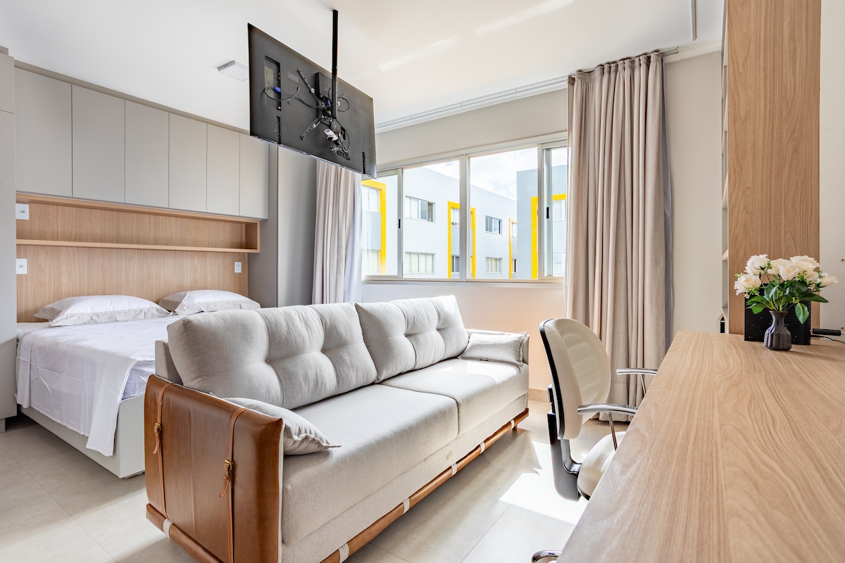 At the Cullinan Hplus Premium hotel. Very new and contemporary. Amazing location! Two malls across the street. Great tourist spots to go on foot. Charming, finely decorated and furnished unit. On the highest floor, with a beautiful view of Brasília and Asa Norte. 29m² luxury suite with king bed. Well equipped with several items for your convenience. Acoustic insulation on the windows for a great rest. Smart TV. Garage. Swimming pool, gym, sauna and restaurant. Check in 24 hours at reception.