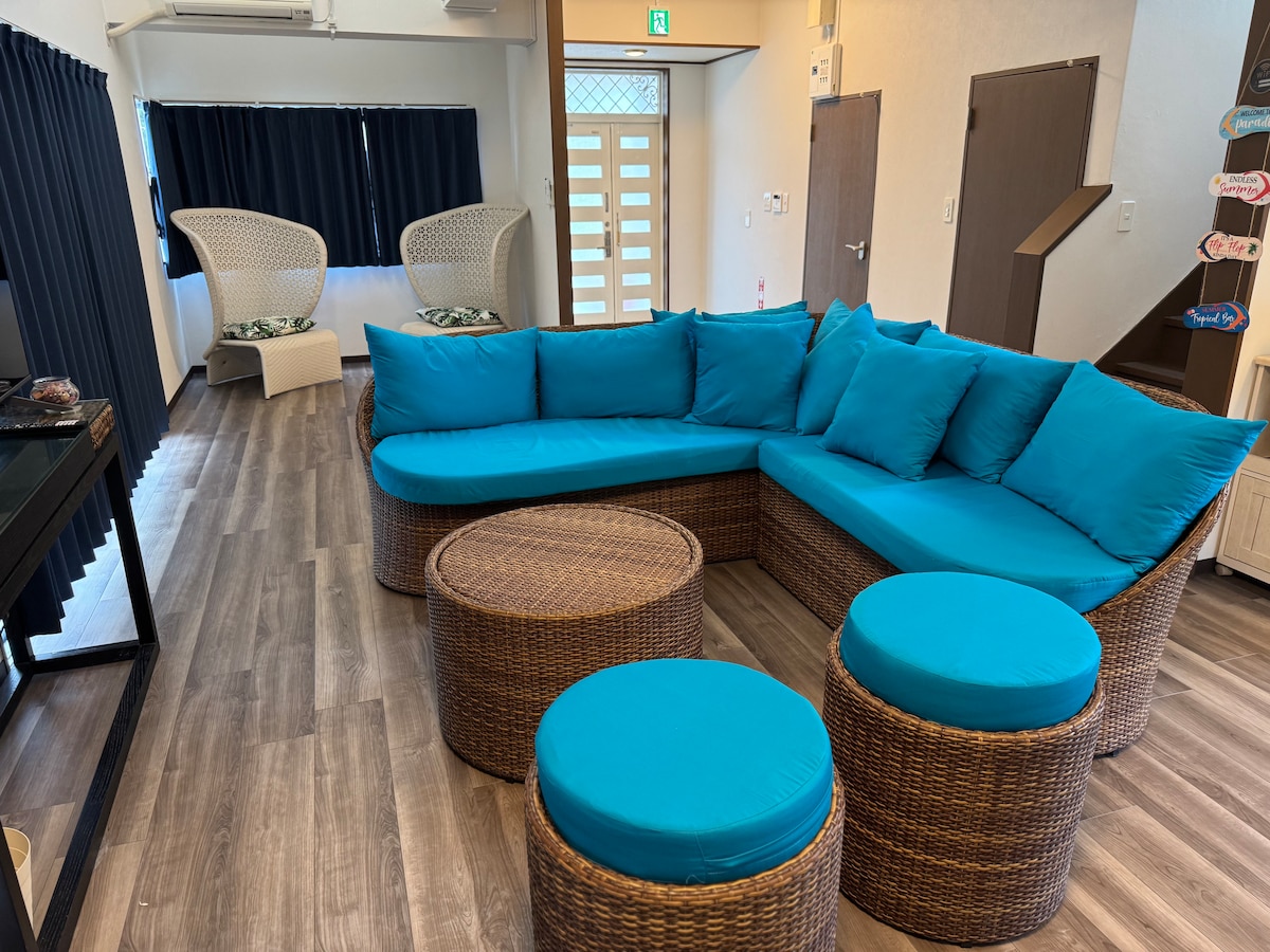 ようこそ!【Base in,Onnason,Okinawa】へ。 当施設は沖縄、恩納村エリアにある1日1組限定貸切のお宿です。 希望が丘入り口前ビーチまでは車で2分の好立地です。 BBQも可能です。(有料) 丸々一軒家を貸切でお貸出になります。 ------Room----- ■ 最大6名様まで宿泊可能 ■ 平米数 75.56㎡(3LDK) 一軒家貸切 ■ 寝室3部屋(全て2階) 寝室1(洋室):シングルベッド2台 寝室2(洋室):シングルベッド2台 寝室3(洋室):セミダブルベッド2台 ■ 浴室 シャワー、湯船 ■お手洗い 2箇所(ウォシュレット付き) ■ 光Wi-Fi完備 ■ 24時間営業コンビニ(ローソン)まで車で3分 -----Access---- 那覇空港から車で1時間 許田 IC→ 国道 58 号 →許田 ICから車で11分 那覇空港からバスで約2時間 →ハレクラニ沖縄前バス停前( 伊武部希望ヶ丘入口)から徒歩11分 ■駐車場 宿泊施設内のスペースに無料駐車(大きさにより2台まで)が可能。 【チェックイン】4:00pm【チェックアウト】10:00am