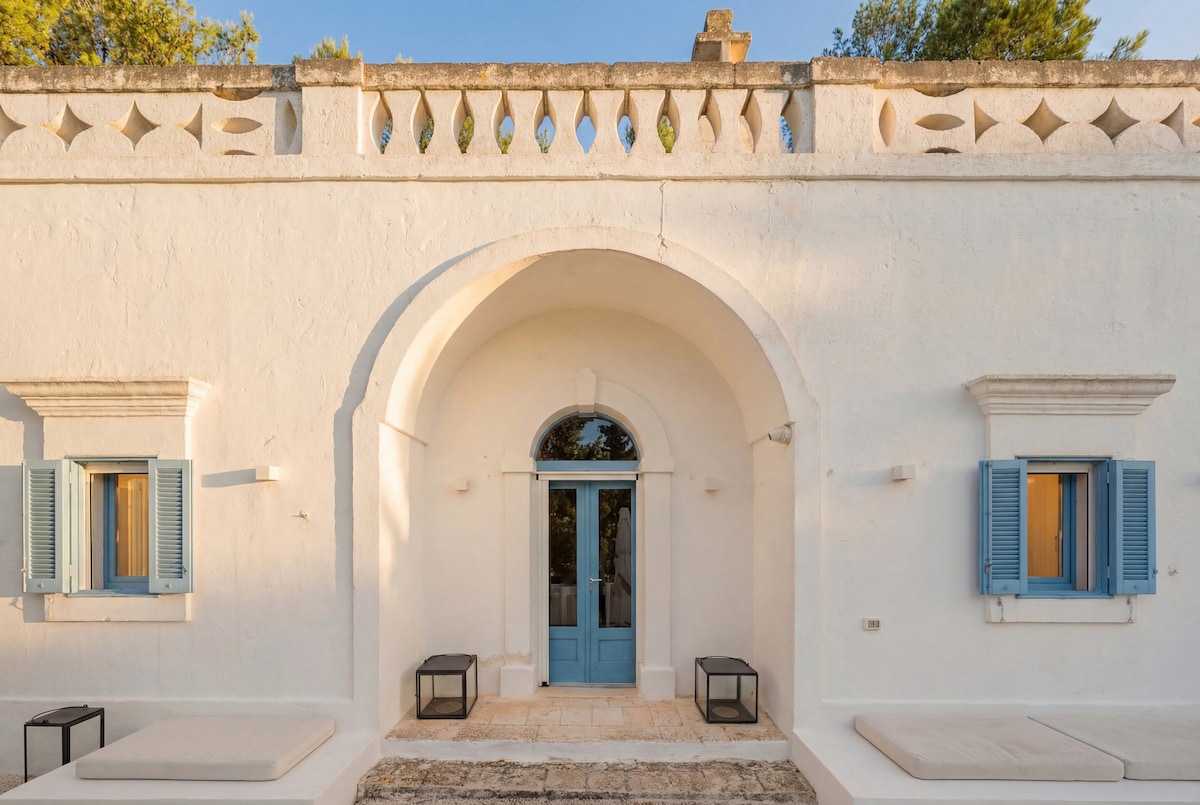Vivi il fascino di una residenza nobiliare Villa storica con grande piscina privata riscaldabile immersa in un parco di 6.000 mq. Costruita nell’800 da un Barone e restaurata con cura, conserva l’eleganza originale con mosaici artistici, arredi Liberty e pezzi unici della collezione nobiliare. Ammira i sontuosi bagni con rari marmi pregiati e una vasca in pietra scolpita a mano.Un’oasi esclusiva ideale per famiglie e amanti della natura. Pet-friendly, vicino al mare ed ai trulli. Wi-fi gratuito.