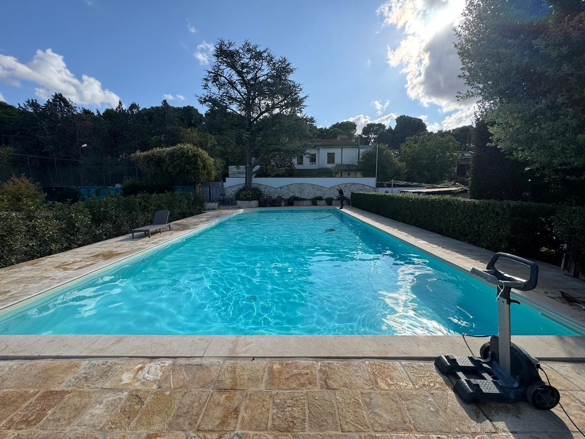 Vivi il fascino di una residenza nobiliare Villa storica con grande piscina privata riscaldabile immersa in un parco di 6.000 mq. Costruita nell’800 da un Barone e restaurata con cura, conserva l’eleganza originale con mosaici artistici, arredi Liberty e pezzi unici della collezione nobiliare. Ammira i sontuosi bagni con rari marmi pregiati e una vasca in pietra scolpita a mano.Un’oasi esclusiva ideale per famiglie e amanti della natura. Pet-friendly, vicino al mare ed ai trulli. Wi-fi gratuito.