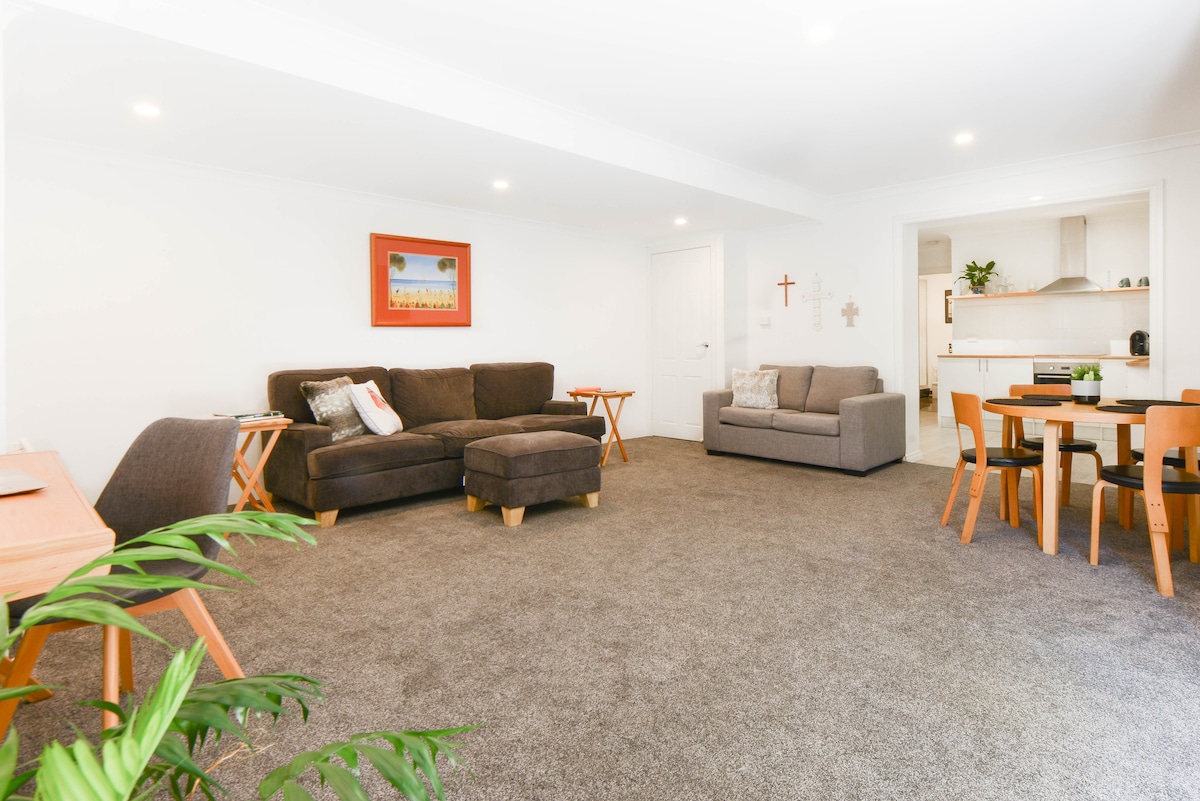 This ambient self-contained flat has everything you need for a pleasant stay. The spacious and comfortable living area has a large T.V, 3-seater couch, and single sofa bed suitable for an extra smguest. ( Please request if required) Separate kitchen, bedroom, and bathroom. Stroll across the road to a 200-acre flora and fauna park or play a round of golf. 5-minute drive to the beach, shopping centers, and train station. Bus stops nearby. Cot, high chair, and change table available upon request