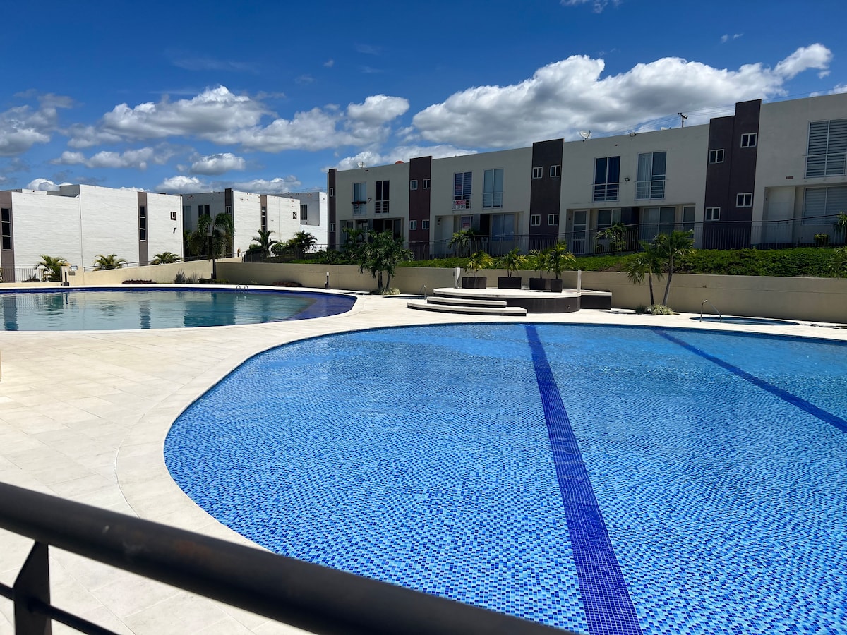 Escápate con pareja y disfruta de un apto solo para ti. El espacio es ideal para descansar, tomarte un baño en el Jacuzzi privado y disfrutar de una hermosa vista. Disfruta de la habitación principal sin compañía en los otros cuartos. Disfrutaras del cuarto principal con baño privado, cocina, sala comedor, jacuzzi, balcón solo para ti y tu pareja. Podrás disfrutas de las demás zonas comunes del condominio como piscina, cancha de tennis,