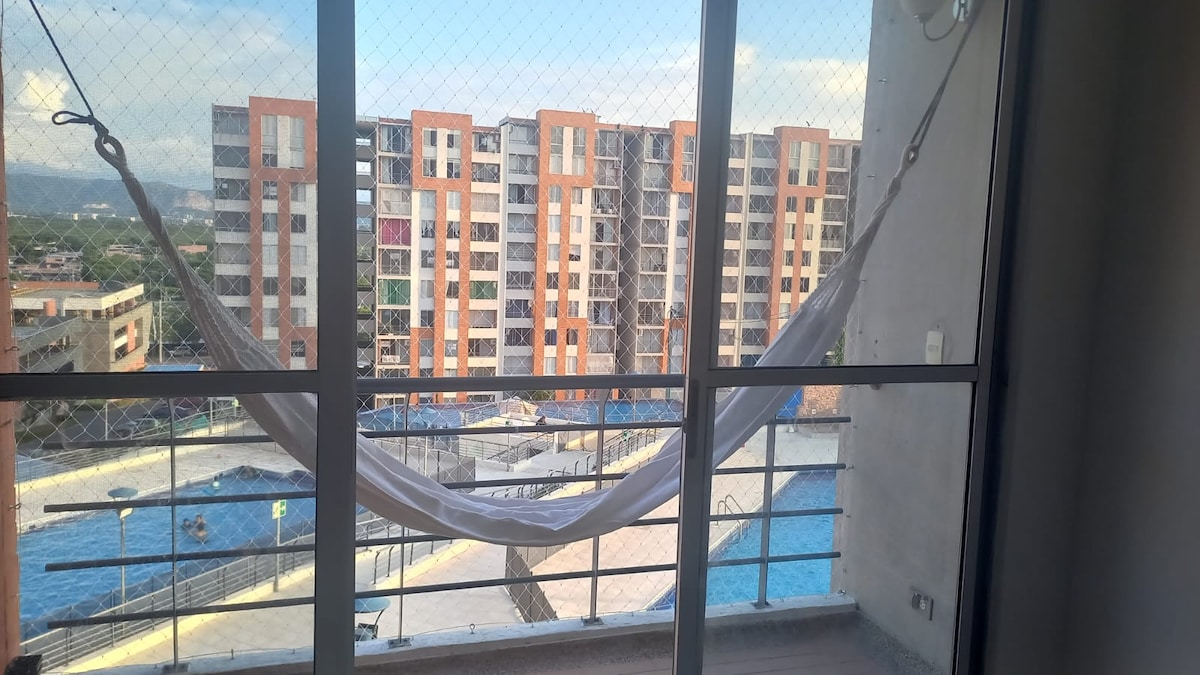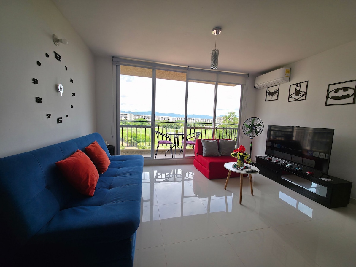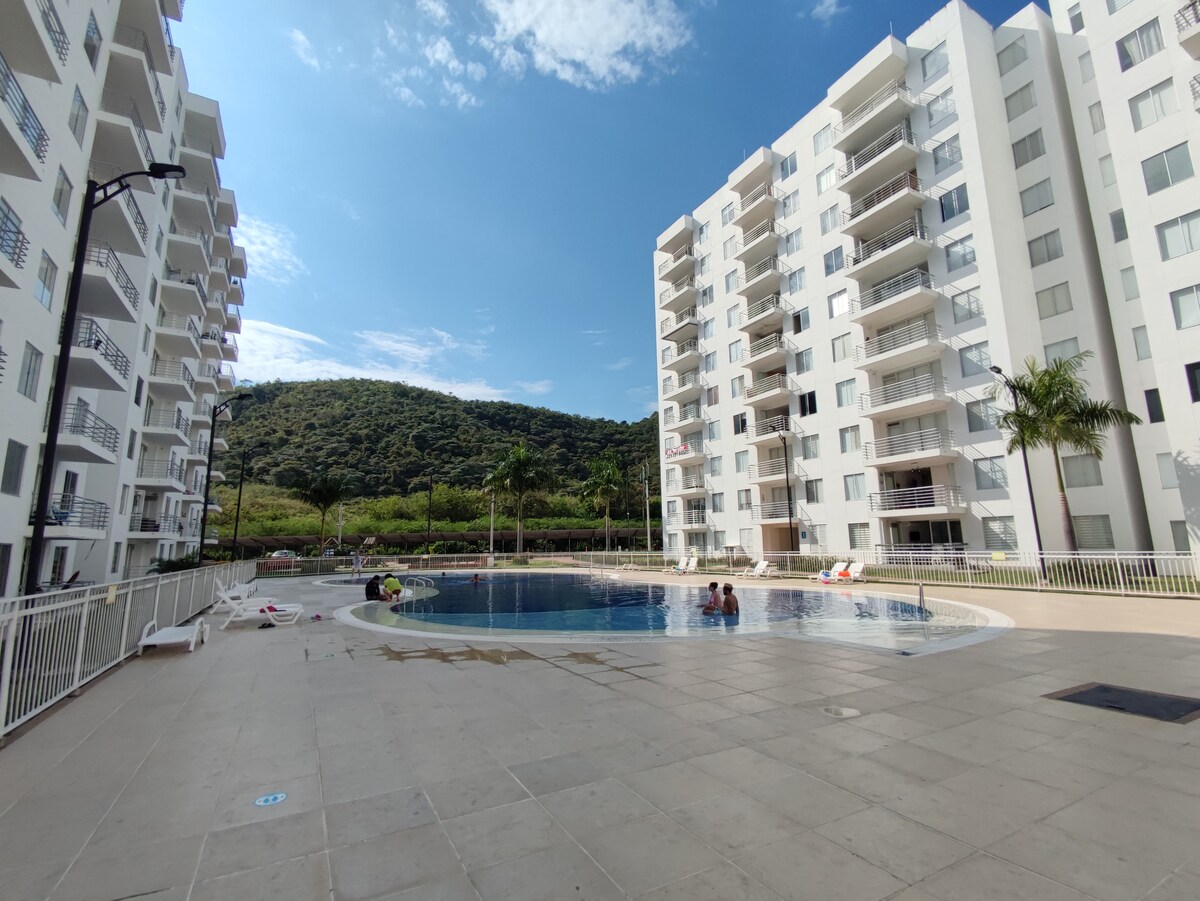 Lindo apartamento vacacional con acabados de lujo totalmente equipado, ideal para descanso en pareja o familia, dispone de tres cómodas habitaciones, balcón, aire acondicionado en habitación principal y zonas sociales (sala y comedor) con vista a la piscina y montaña, rodeado de vegetación y naturaleza. Excelente ubicación dentro de la ciudad de Girardot, a 1200 mts del estadio de fútbol , a 3 minutos en carro del nuevo Almacen Olimpica, supermercado D1 y Ara.